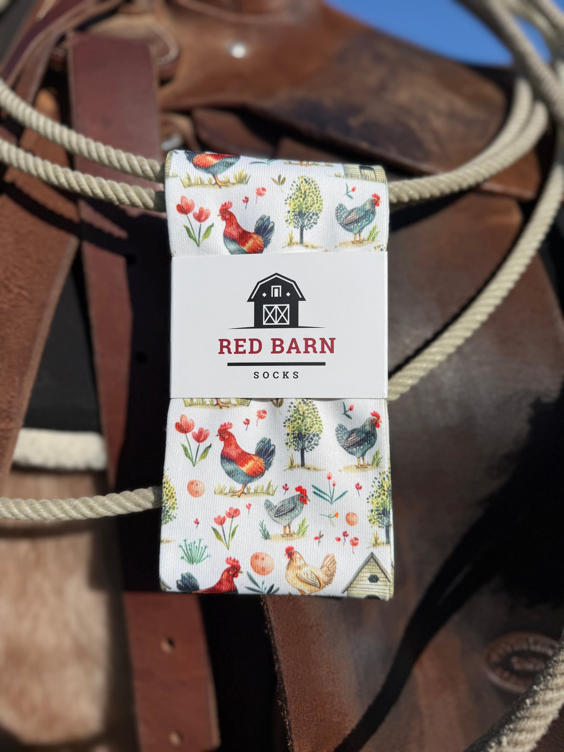 Life is always better with chickens! Step into Country Cluckers - Red Barn Socks and experience comfort and country charm. These socks are designed for both durability and comfort, featuring a stay-up fit, soft and breathable material, and seamless design for ultimate all-day wear. Perfect for your favorite cowboy boots, farm boots, or any type of footwear. Elevate your footwear with these country-chic socks!