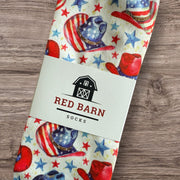 Bring a little American pride to your step with Howdy America - Red Barn Socks. This fun pattern featuring bold cowboy hats in red, white, and blue are perfect for 4th of July festivities! Made with our signature stay-up fit, seamless toe, and soft, breathable fabric, they're built for all-day comfort whether you are riding, working, or celebrating.