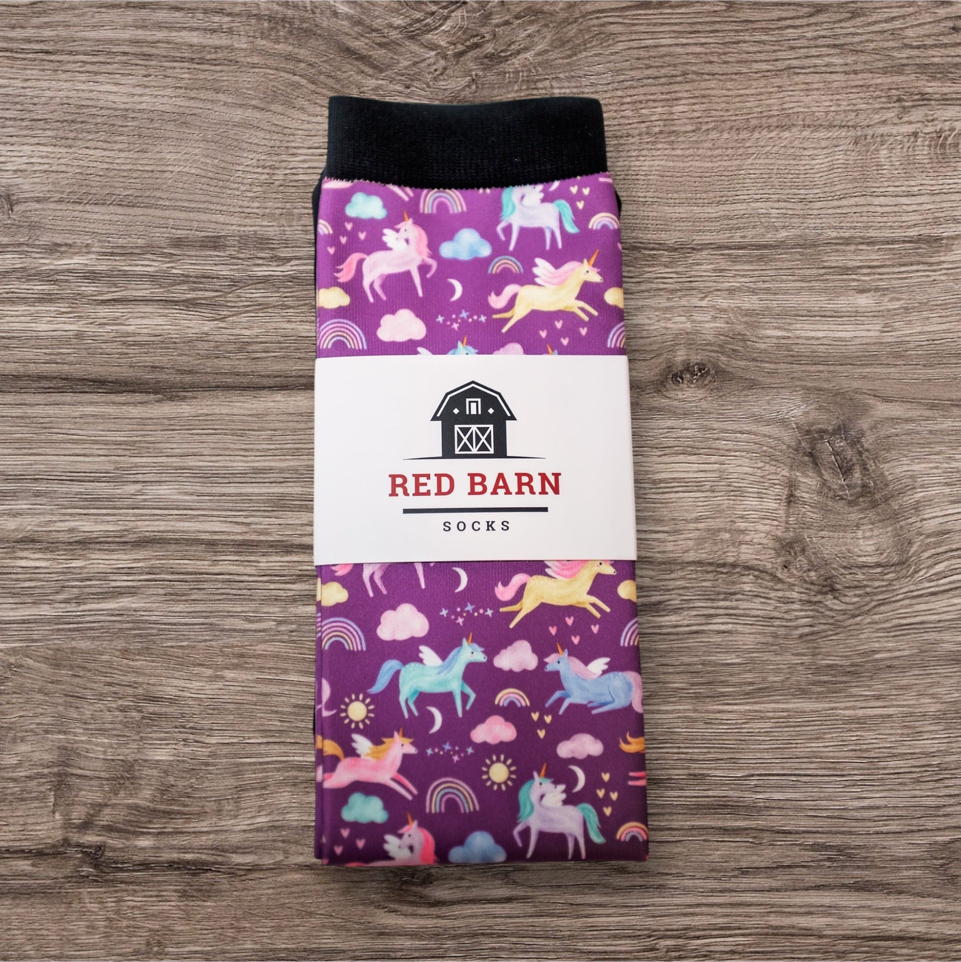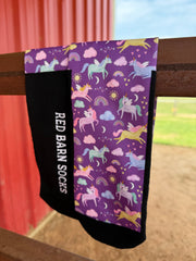Let your imagination run wild in Unicorn Trails - Red Barn Socks, now in petite/youth size. Featuring whimsical unicorns in a perfect purple, these sock are perfect for young riders, petite adults, dreamers, and adventurers alike.