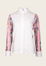 A beautiful buttoned show shirt made from a technical sports fabric with a four way stretch and UV protection. A white front center panel covers the buttons in the middle. The standup white show collar is well constructed to keep retain its shape and finished off with a golden Espoir custom button. The structured cuffs are finished off with custom Espoir gold buttons. All designs are hand illustrated. A proudly South African designed and produced garment.