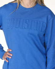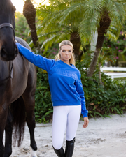 The Colette Crewneck in Royal Blue is the perfect go-to sweatshirt. It provides a perfect laid-back feel while also looking stylish. The Colette Crewneck, made from knitted cotton, has an embossed logo and pairs perfectly over your favorite Equisite shirt for chilly horse show and barn mornings.