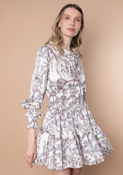The long sleeves add a touch of sophistication, while the flattering smocked waist and subtle ruffled skirt create a feminine and versatile silhouette—perfect for fall events, equestrian gatherings, or everyday elegance.