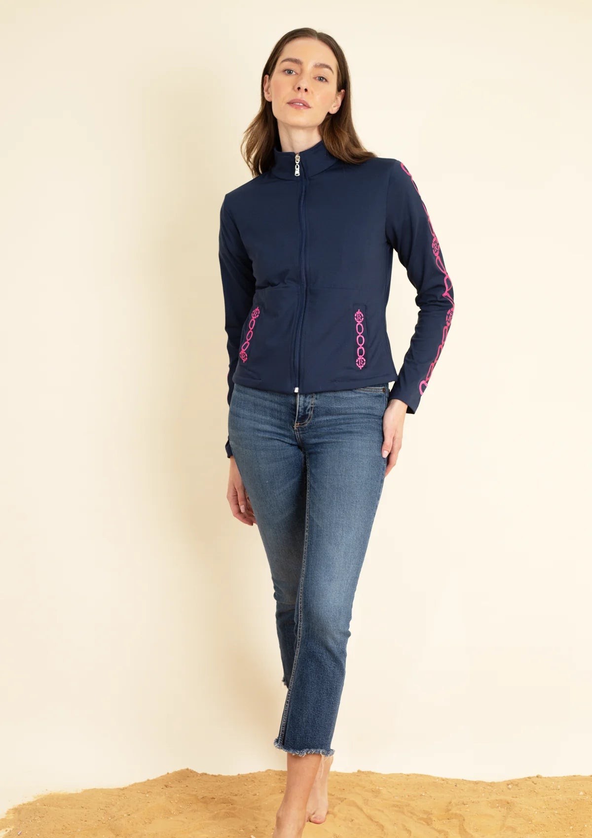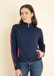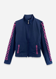 Elevate your riding wardrobe with the Equus Embroidered Zip Jacket, a perfect blend of style and performance. Crafted from our iconic high-tech, functional fabric, this sporty zip-up features elegant equestrian embroidery on the sleeves, adding a timeless touch to your ensemble. The striking color combination of navy and pink ads a colorful touch to your outfit, whether you're in the saddle or styling a chic athleisure look. Designed for those who appreciate equestrian fashion and practical luxury, this jacket is a must-have for your fall riding wardrobe.