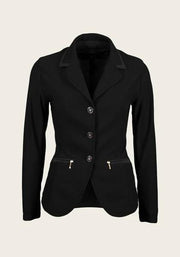 A fitted show jacket made from a durable mesh fabric, stylishly executed with princess style lines. The front panel is closed with beautiful custom Espoir buttons which match smaller buttons on each sleeve. Tone on tone piping details on the collar and front pocket zips add sophisticated details to this jacket. A sporty, sophisticated styled equestrian jacket specifically designed for warmer days out showing.