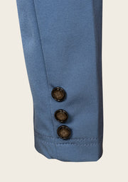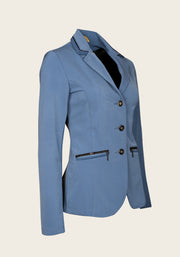 A fitted show jacket made from a lightweight stretchable fabric, stylishly executed with princess style lines. The front panel is closed with beautiful custom Espoir buttons which match smaller buttons on each sleeve.Tone on tone details on the collar and front pocket zips add sophisticated details to this jacket. A sporty, sophisticated styled equestrian jacket.