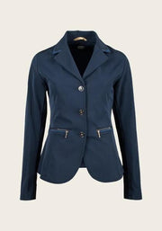 A fitted show jacket made from a lightweight stretchable fabric, stylishly executed with princess style lines. The front panel is closed with beautiful custom Espoir buttons which match smaller buttons on each sleeve.Tone on tone details on the collar and front pocket zips add sophisticated details to this jacket. A sporty, sophisticated styled equestrian jacket.