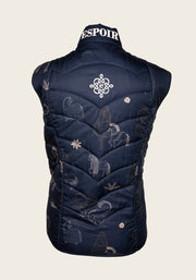 A sleeveless puffer jacket with a beautiful hand illustrated design on the fabric.