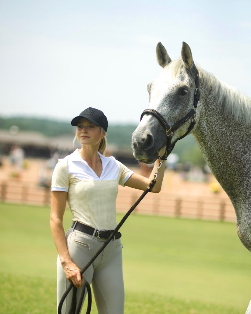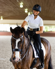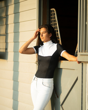 The Genevieve Shirt is perforated for perfection. This style is designed to provide aeration, muscle support and a form-flattering look. Genevieve has a white bib for appropriateness in all show rings. The minimal embroidery on the back finishes off the look with style. Available in White, Jet Black, Skylight and Buttercup, and is made from 80% Nylon, 20% Spandex.