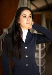 The perfect show coat for hunter and Big EQ riders. A fitted show jacket made from a lightweight stretchable fabric, stylishly executed with princess style lines. The front panel is closed with beautiful custom Espoir buttons which match smaller buttons on each sleeve.