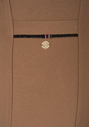 A comfortable and innovative breech with a designed side pocket for a phone. Finished with a custom Espoir golden name plate on the side phone pocket and signature crossed back belt loop in Espoir colours. Tone on tone glitter details on the pocket zips and slimming stitch lines add sophisticated details to this collection.