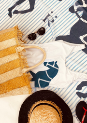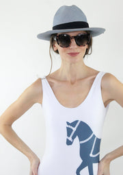 Get ready to make equestrian-waves with our Marina Onepiece Bathing Suit, now re-stocked for the summer season. This preppy and flattering swimsuit, featuring elegant horse silhouettes on the front and back, celebrates your love for horses with every splash. Perfect for beach days, pool parties, or simply soaking up the sun, the Marina Onepiece combines style, comfort, and a unique design that sets you apart. Embrace the summer with confidence and charm in this must-have piece!