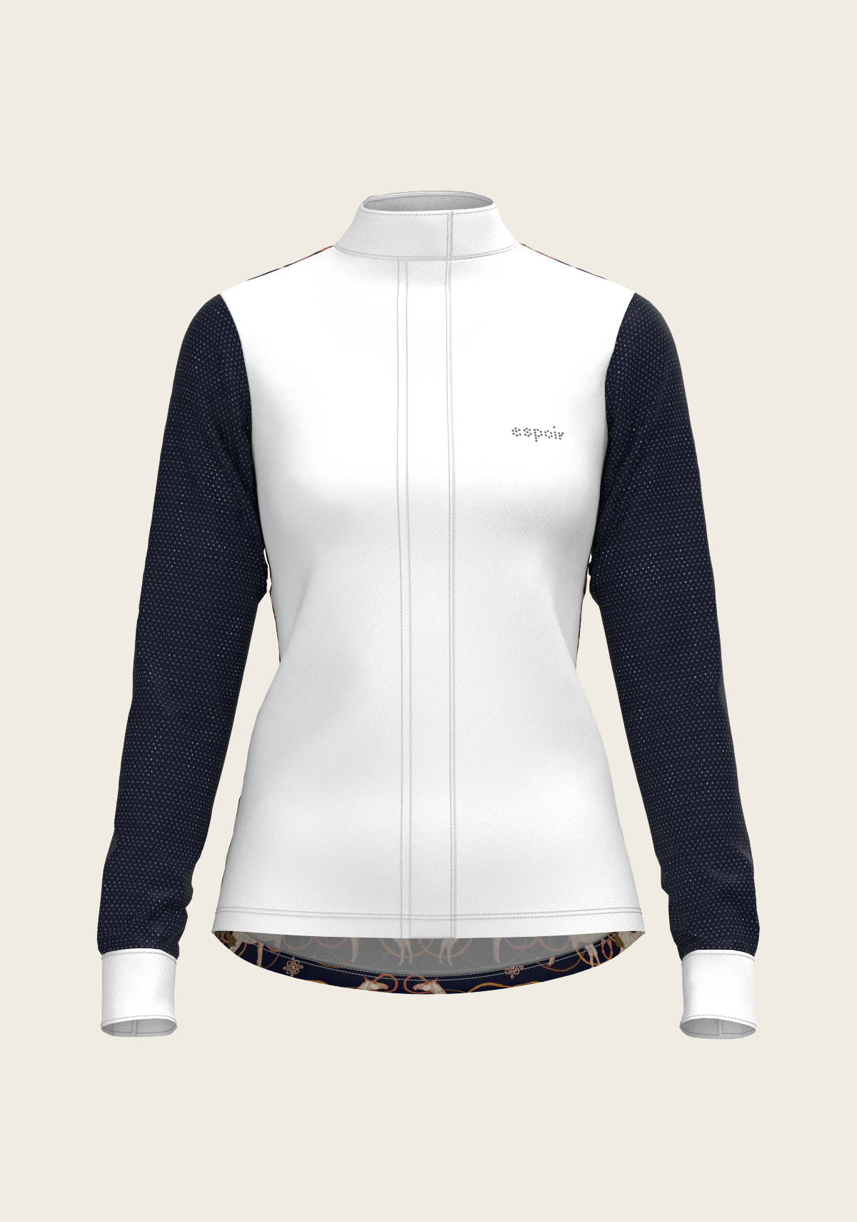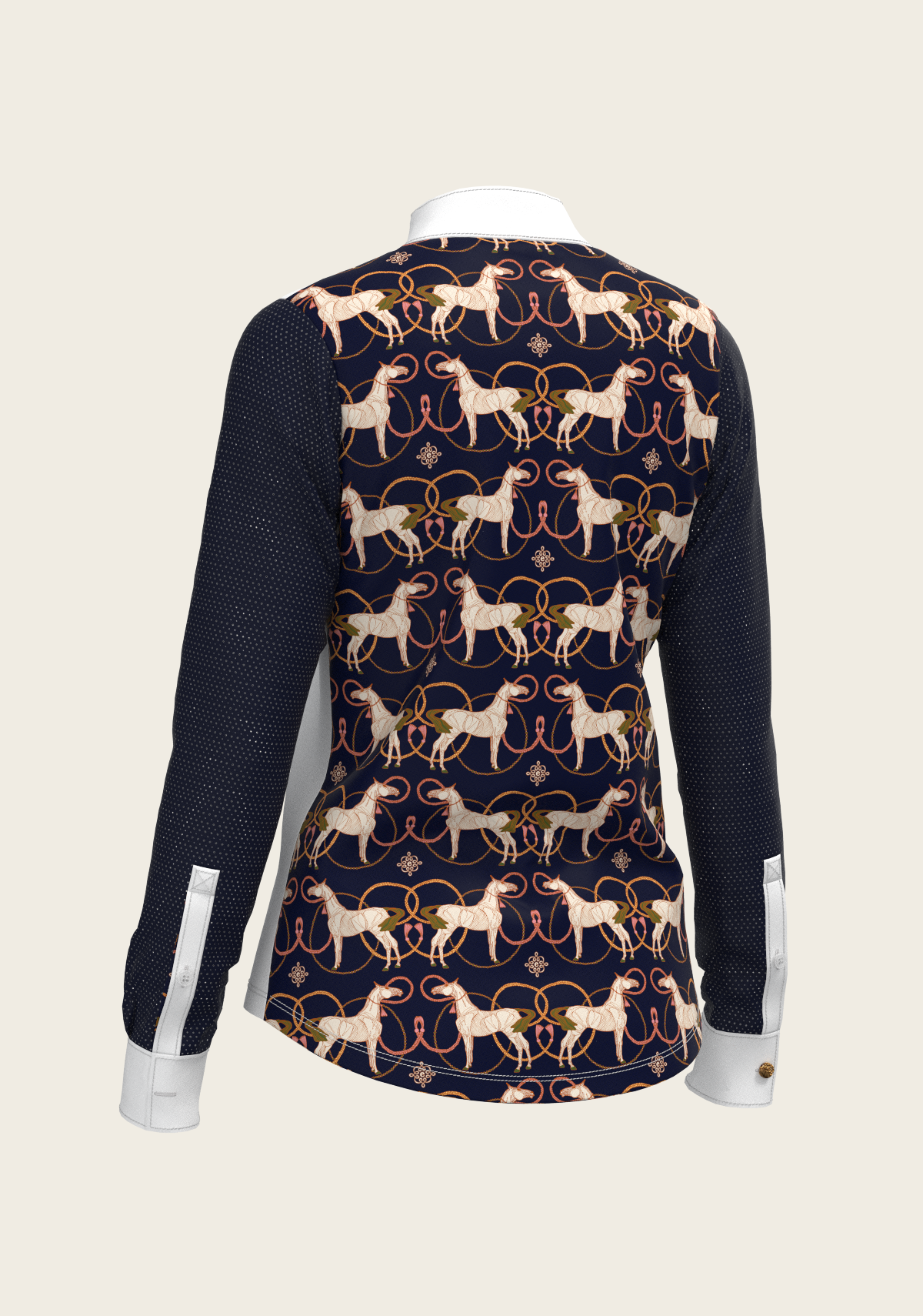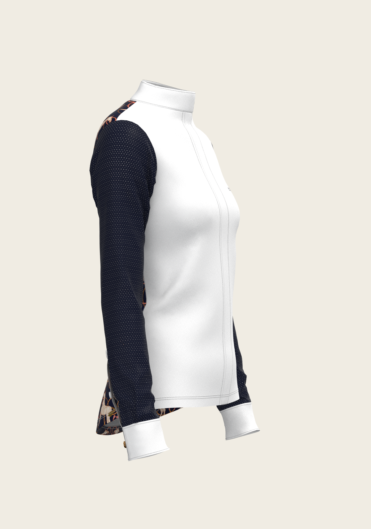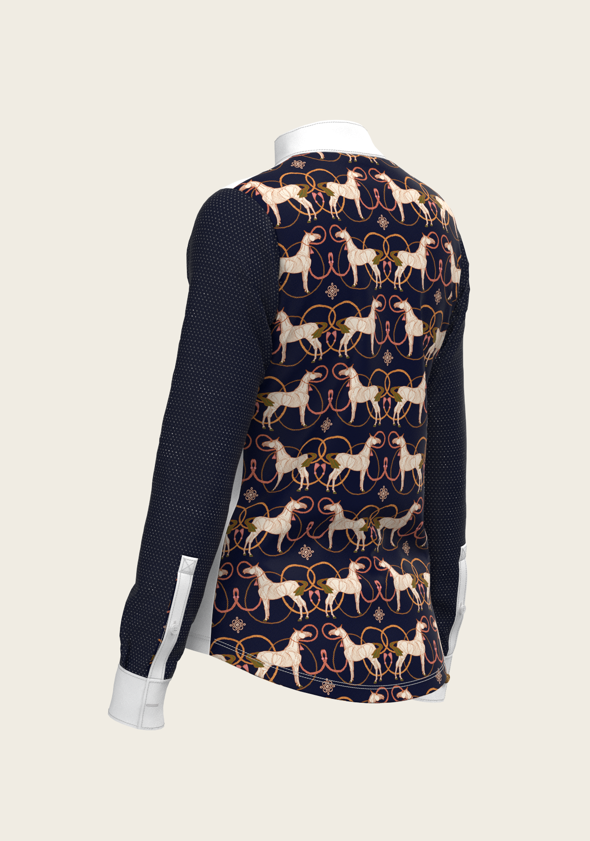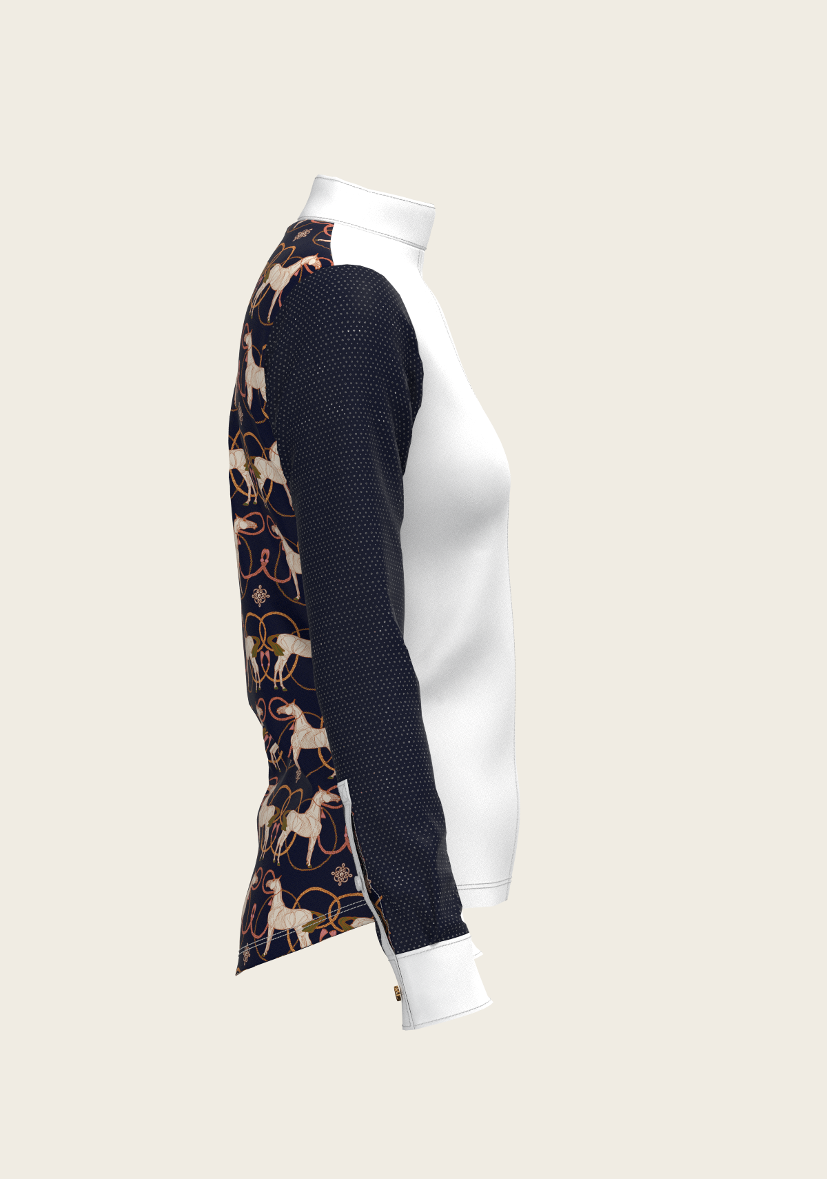 A new collection of formal show shirt made from a selection of luxurious technical fabrics. This collection boasts fine pleated details, custom Espoir gold buttons on the cuffs, easy opening hidden zips and custom Espoir petersham ribbon loops. Each style of shirt is available in formal white as well as a selection of hand illustrated prints. The crown of our new Full Circle Collection and perfect shirt for any show day outfit.