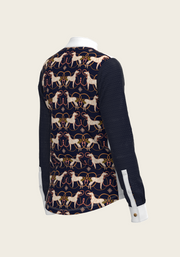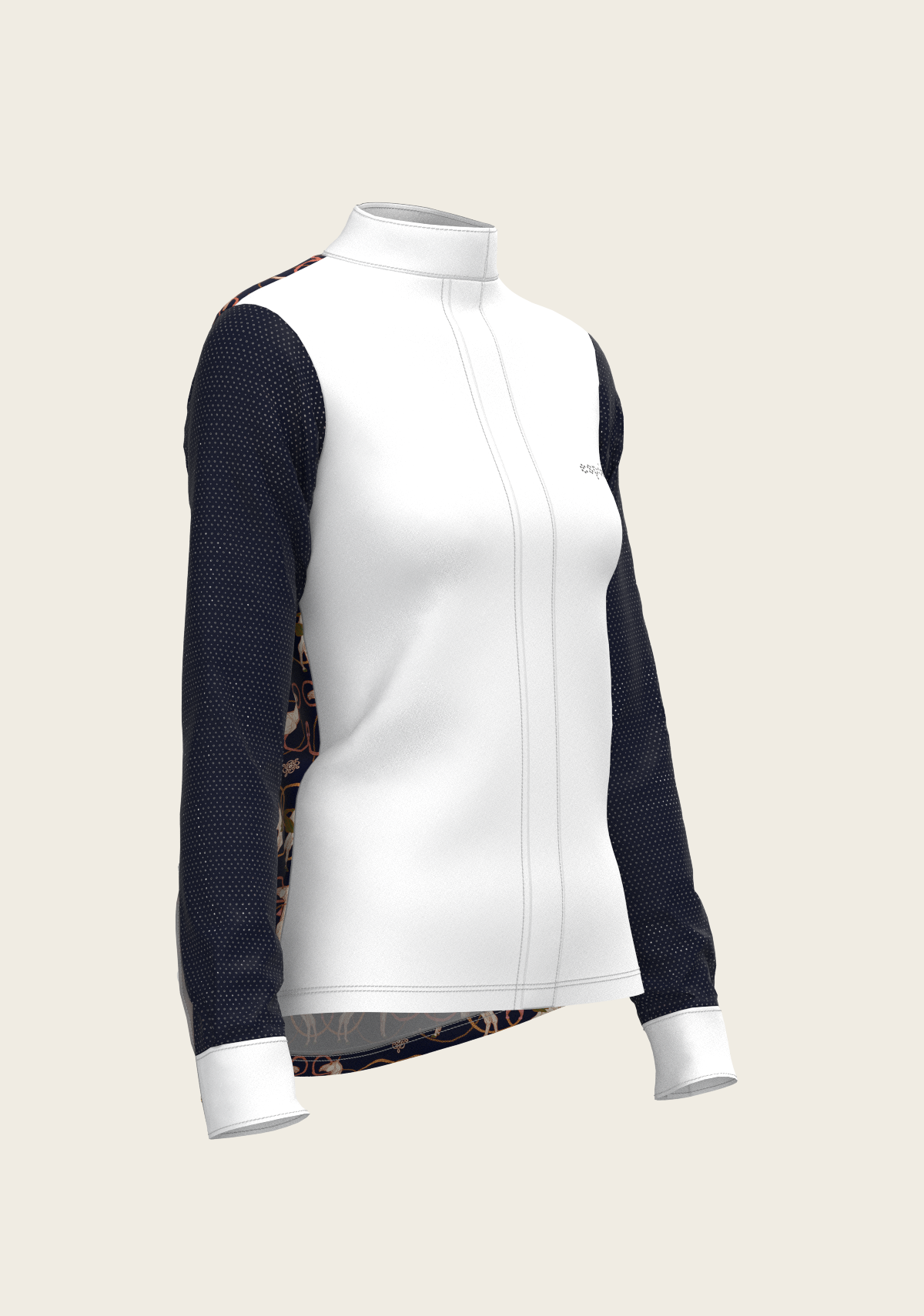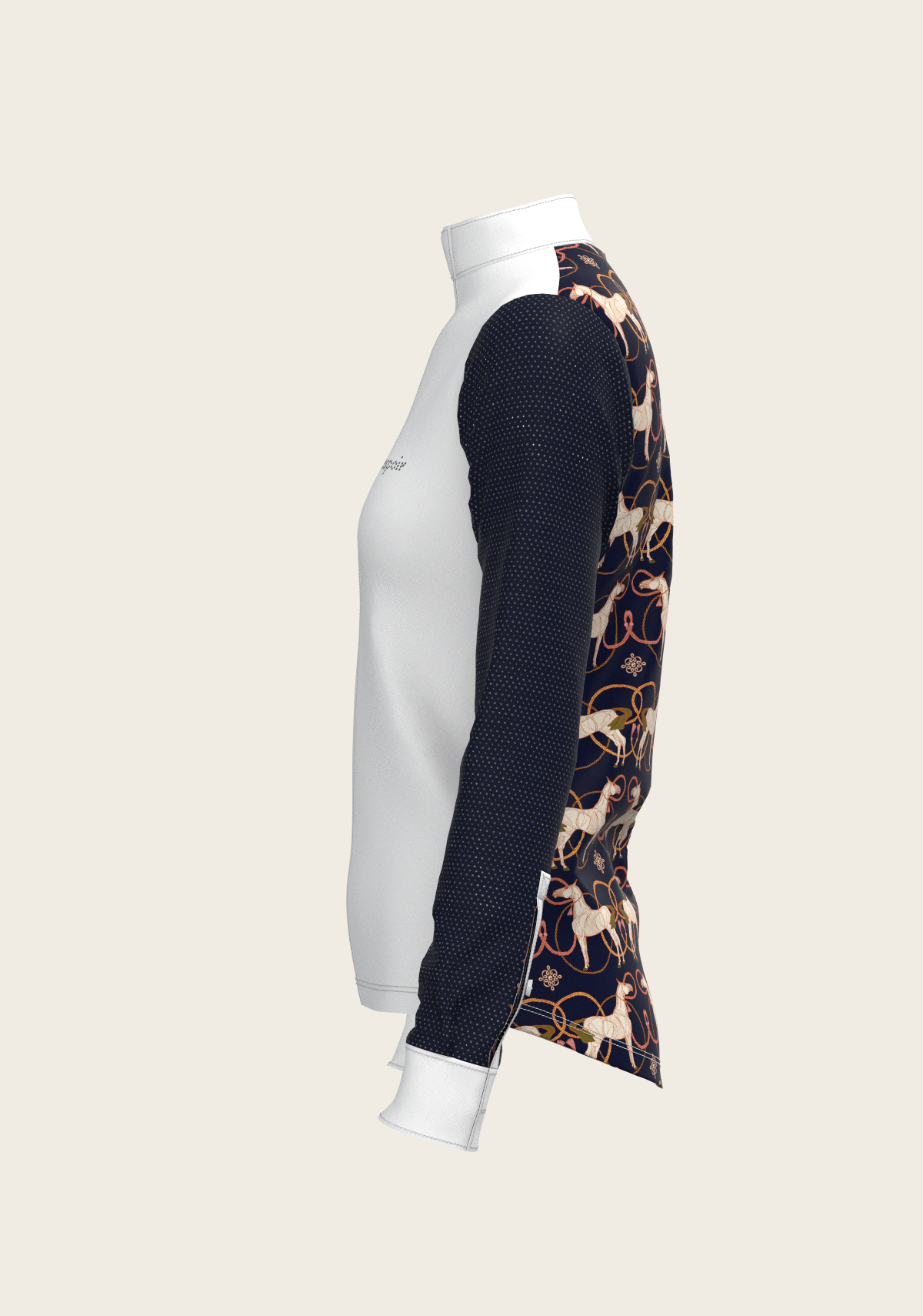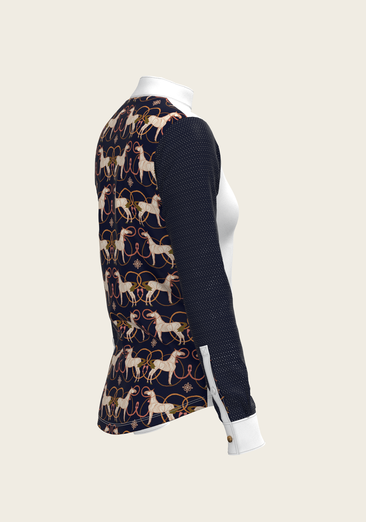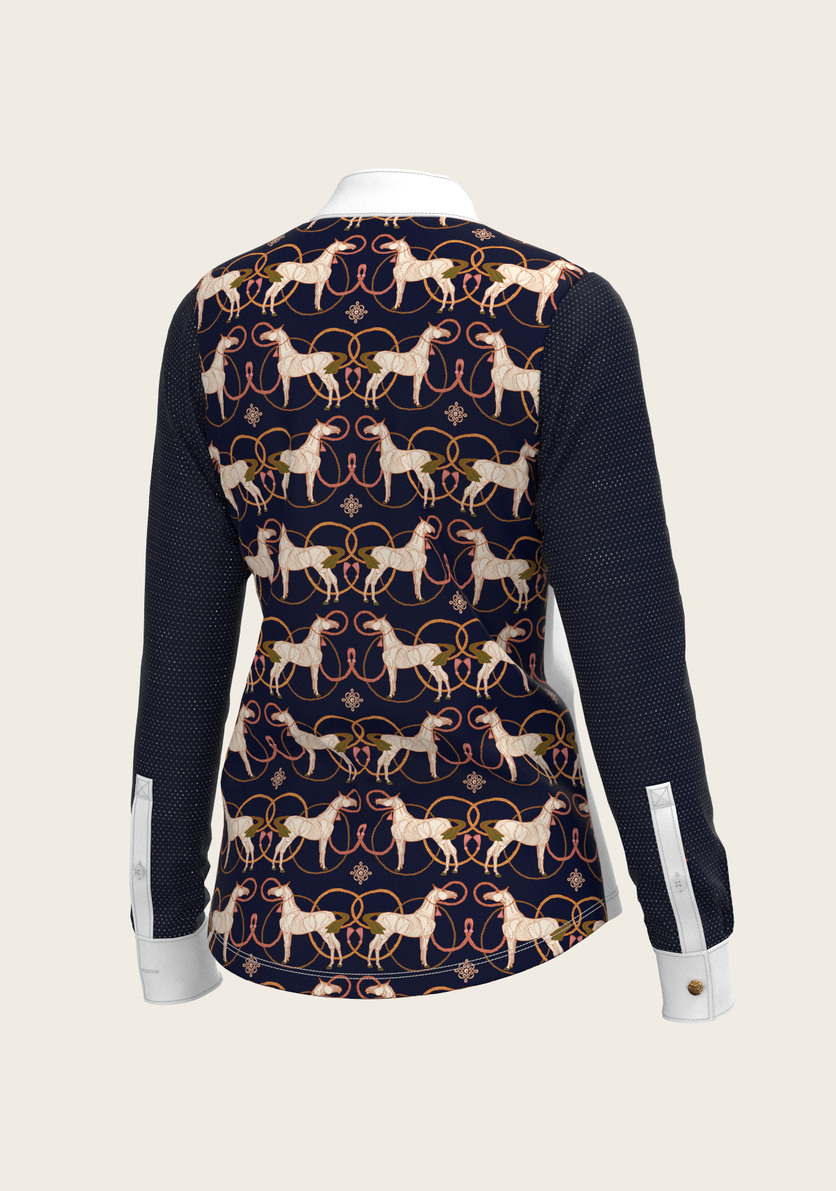 A new collection of formal show shirt made from a selection of luxurious technical fabrics. This collection boasts fine pleated details, custom Espoir gold buttons on the cuffs, easy opening hidden zips and custom Espoir petersham ribbon loops. Each style of shirt is available in formal white as well as a selection of hand illustrated prints. The crown of our new Full Circle Collection and perfect shirt for any show day outfit.