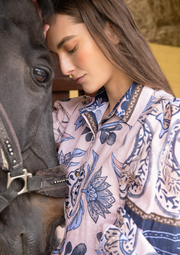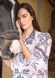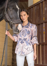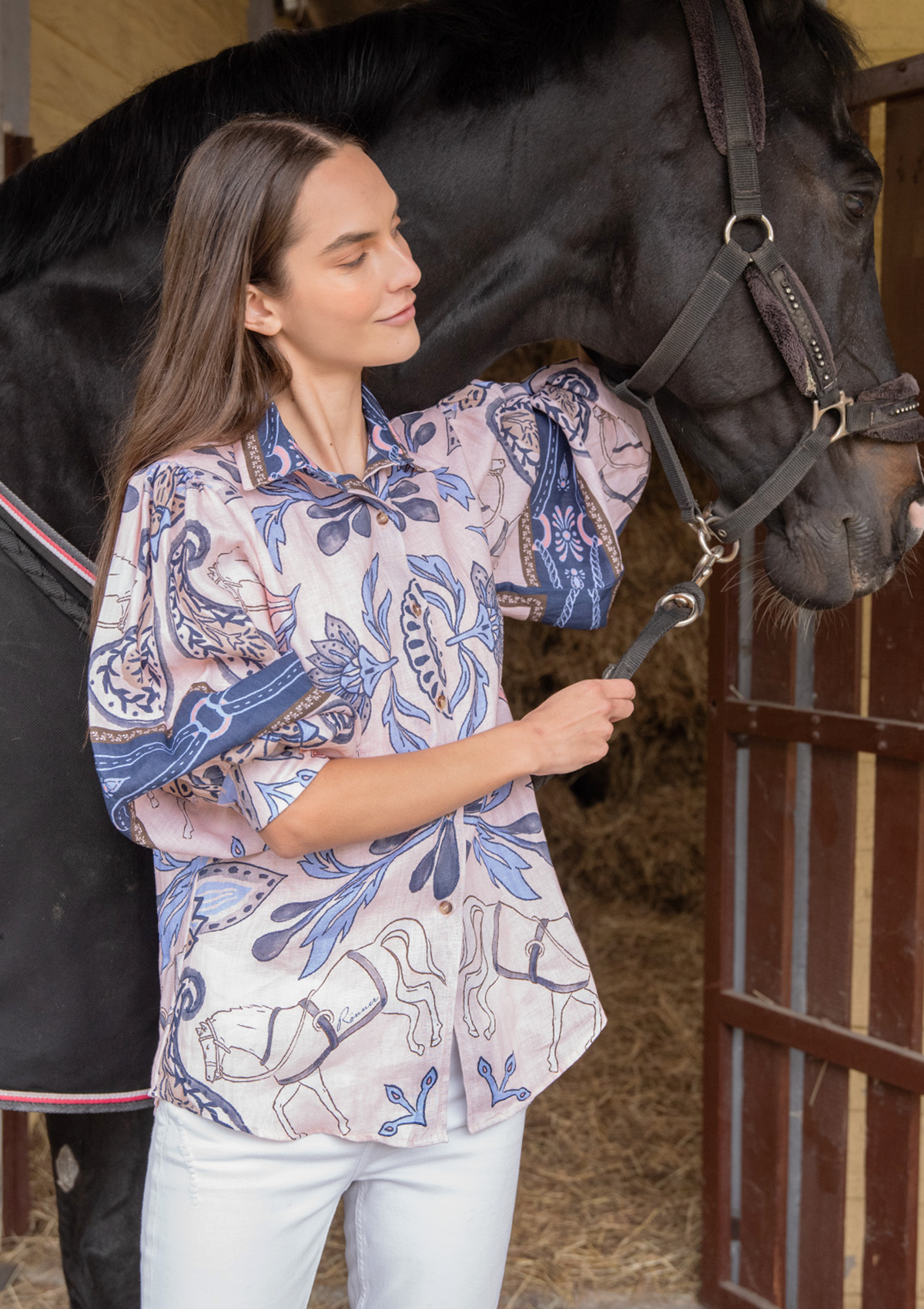 Our Linen Button-Down Shirt with Lantern Sleeves, featuring the enchanting Lilyrose print for a touch of equestrian elegance. Crafted from lightweight linen, this shirt combines classic sophistication with unique charm. The lantern sleeves add a feminine twist to the traditional button-down silhouette, while the Lilyrose print infuses the shirt with timeless beauty and floral delight. Perfect for adding a touch of equestrian flair to your summer wardrobe, this shirt is versatile enough for both casual outings and special occasions. Embrace the essence of summer with our Linen Button-Down Shirt in the Lilyrose print, your go-to choice for effortless equestrian-inspired style.
