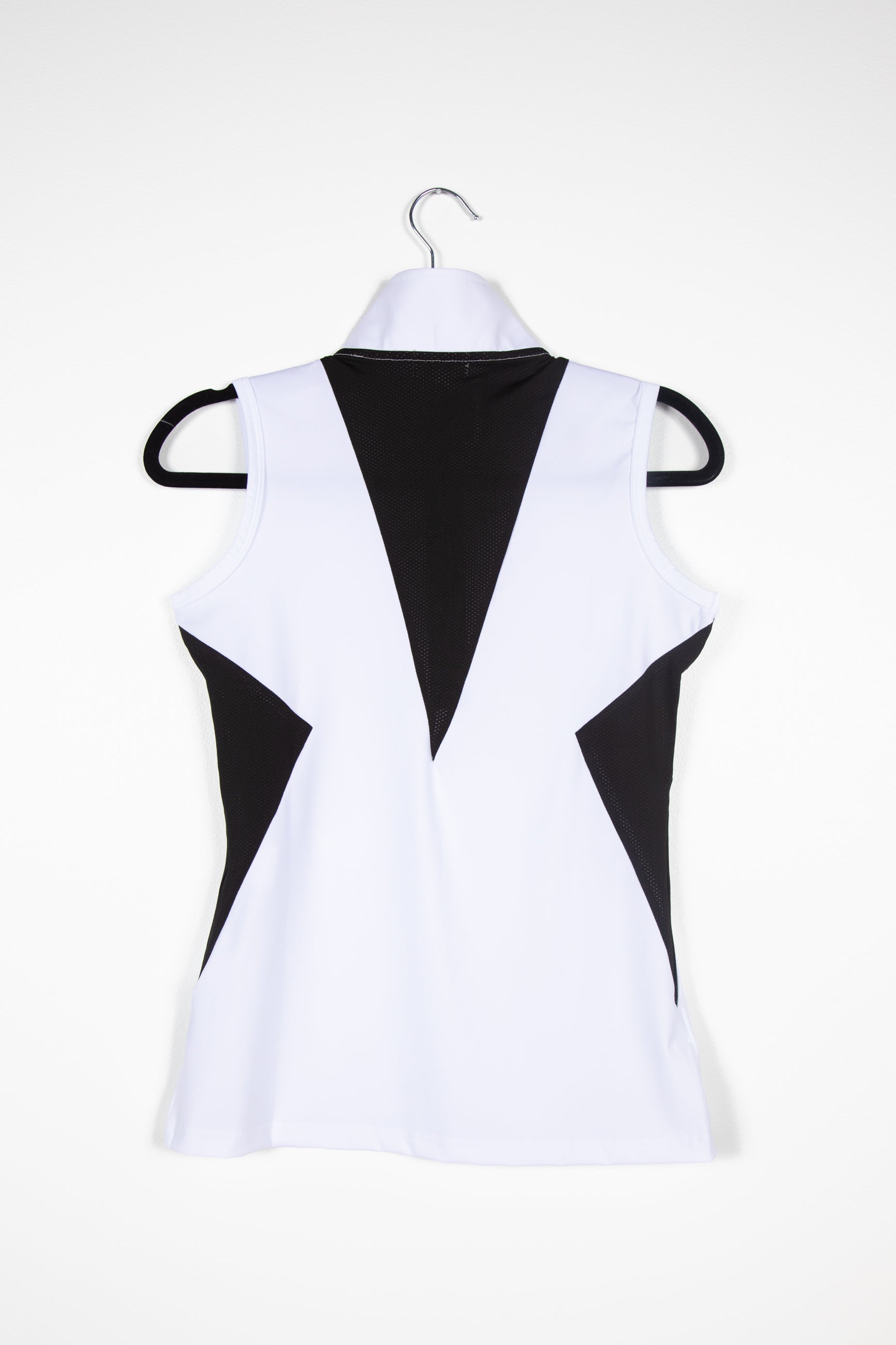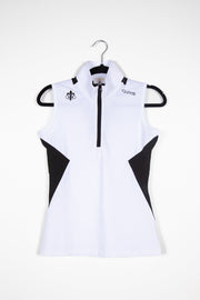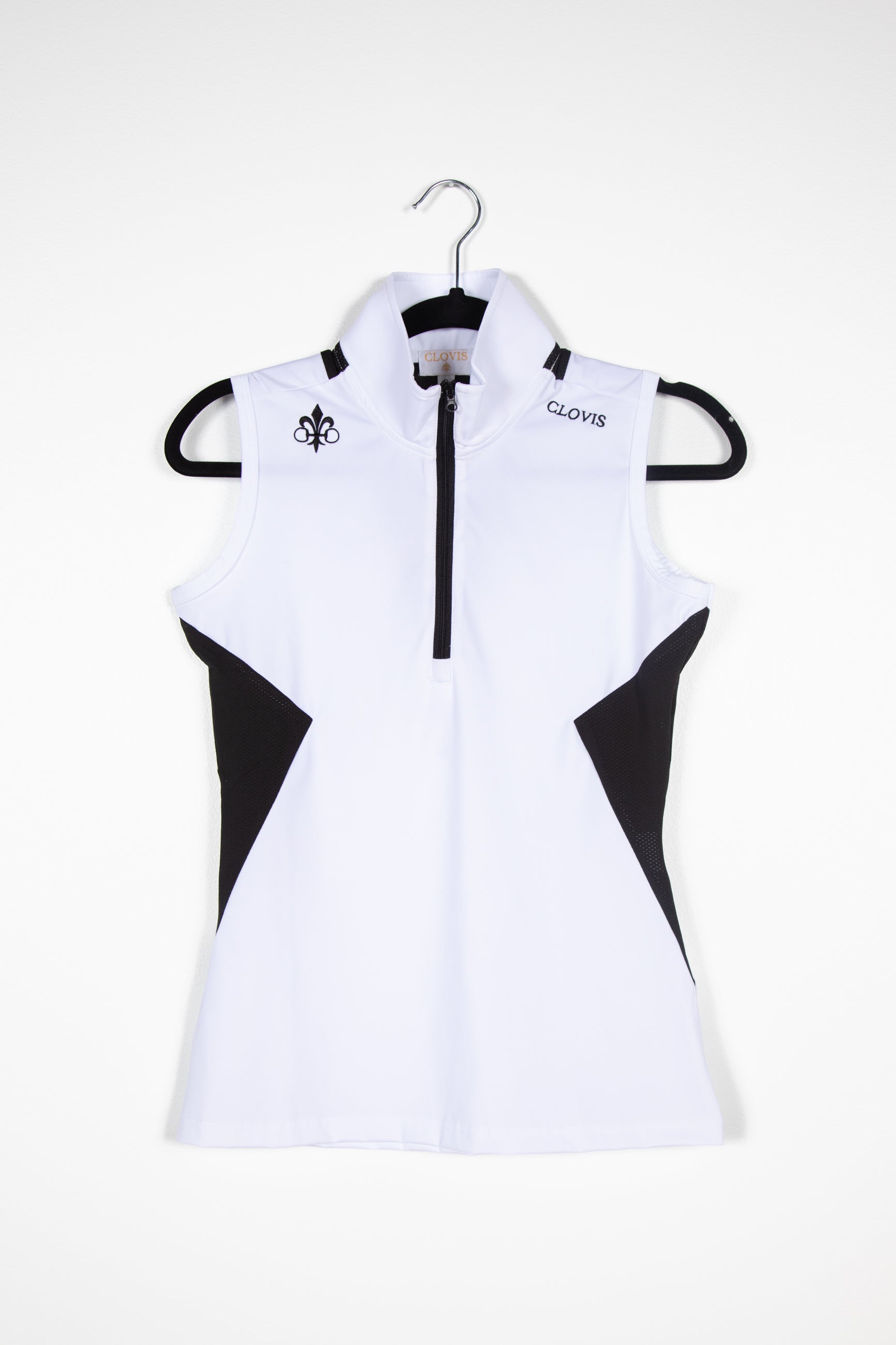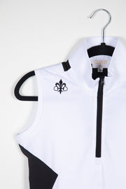 The Artemis is the newest take on our classic sleeveless 1/4 zips. She is named after the Greek Deity Artemis - daughter of Zeus goddess of the moon and the wilderness, and representative of the Zodiac sign Cancer. She comes in the sleekest and softest white, with flattering black mesh darts where it counts to keep you looking your best, but also calm and cool in the saddle. We know Cancers have allllll the feelings, but you'd never know once you don the Artemis and channel the goddess of the hunt!