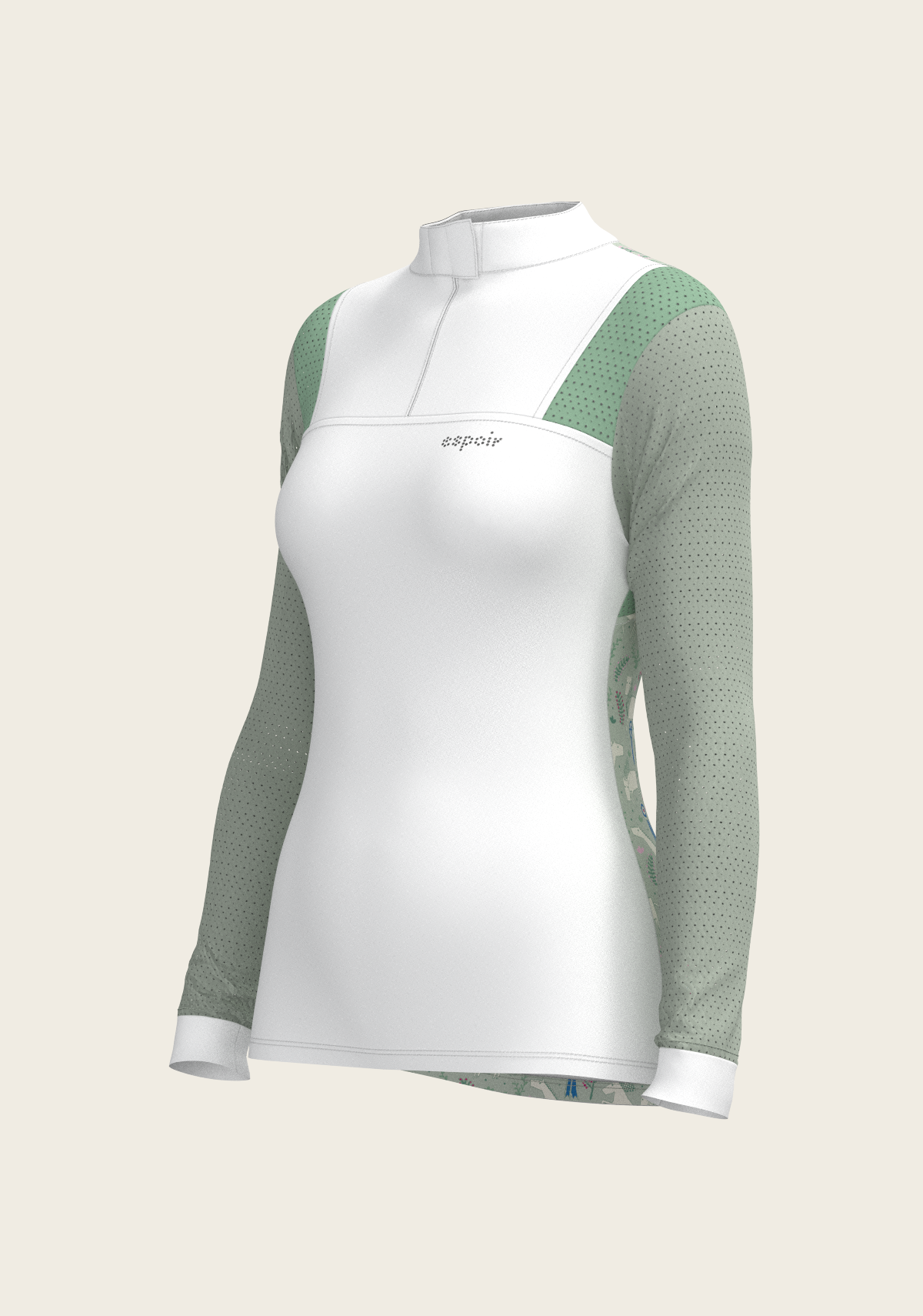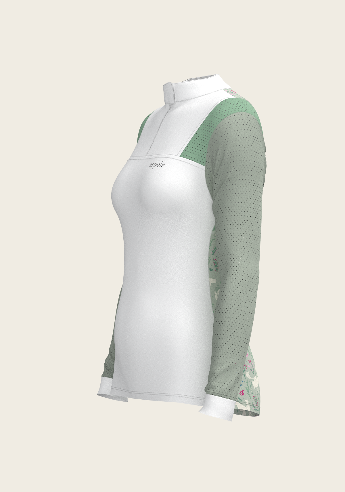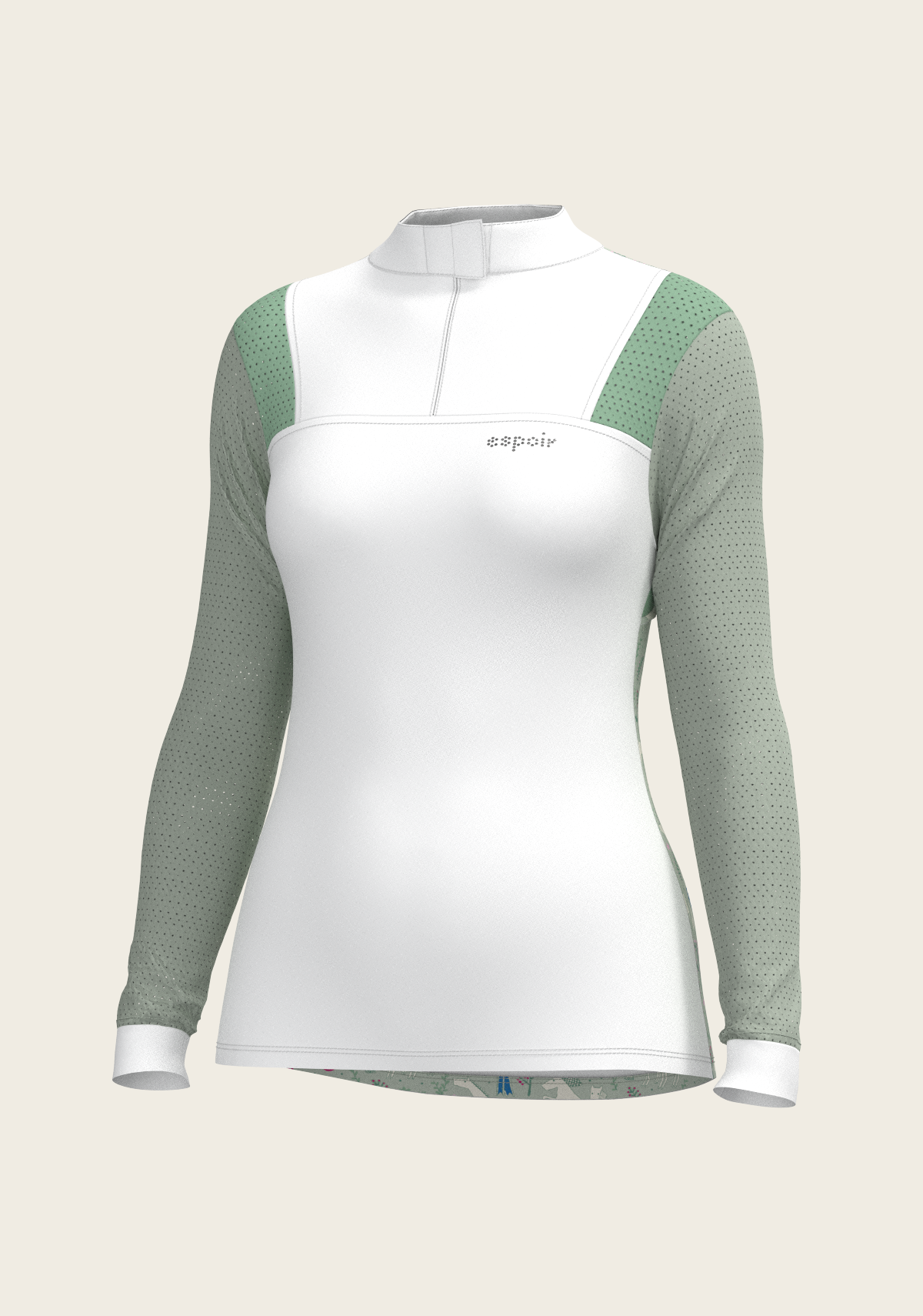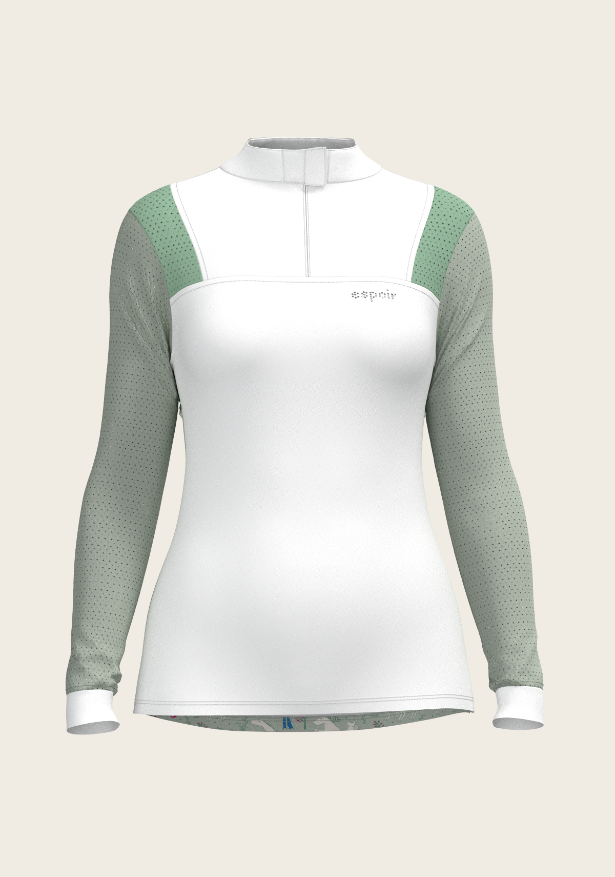 A sporty looking show shirt made from luxurious technical fabrics. A hidden quarter zip is neatly constructed by a printed inner detailed fabric. On the front chest there is a Swarovski logo detail. Two hidden stud buttons easily closes the top collar. Mesh inserts on the front and back of the shirt add beautiful details. The back of the collar has our signature Espoir ribbon detail. These show shirts are available in long and short sleeve.