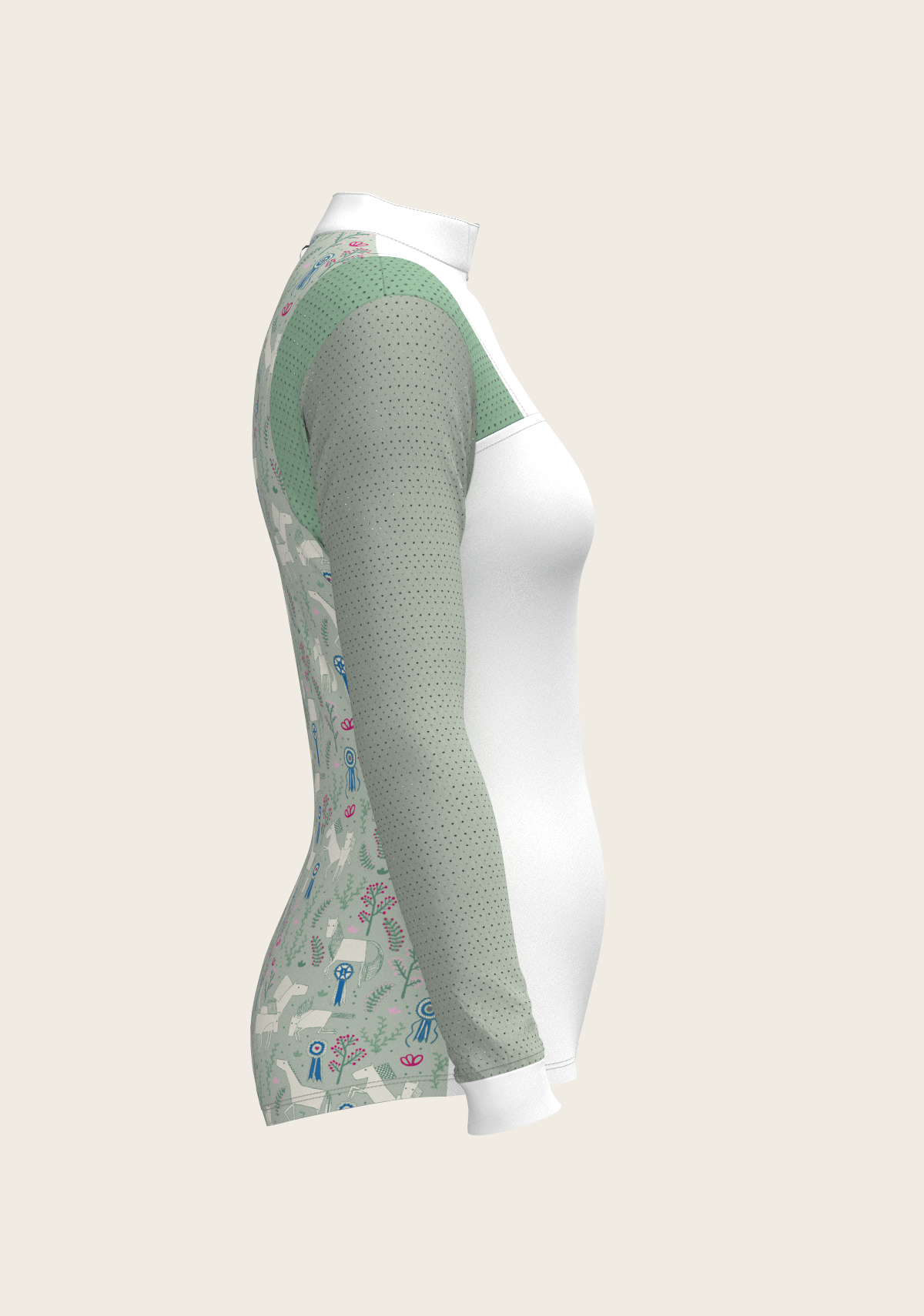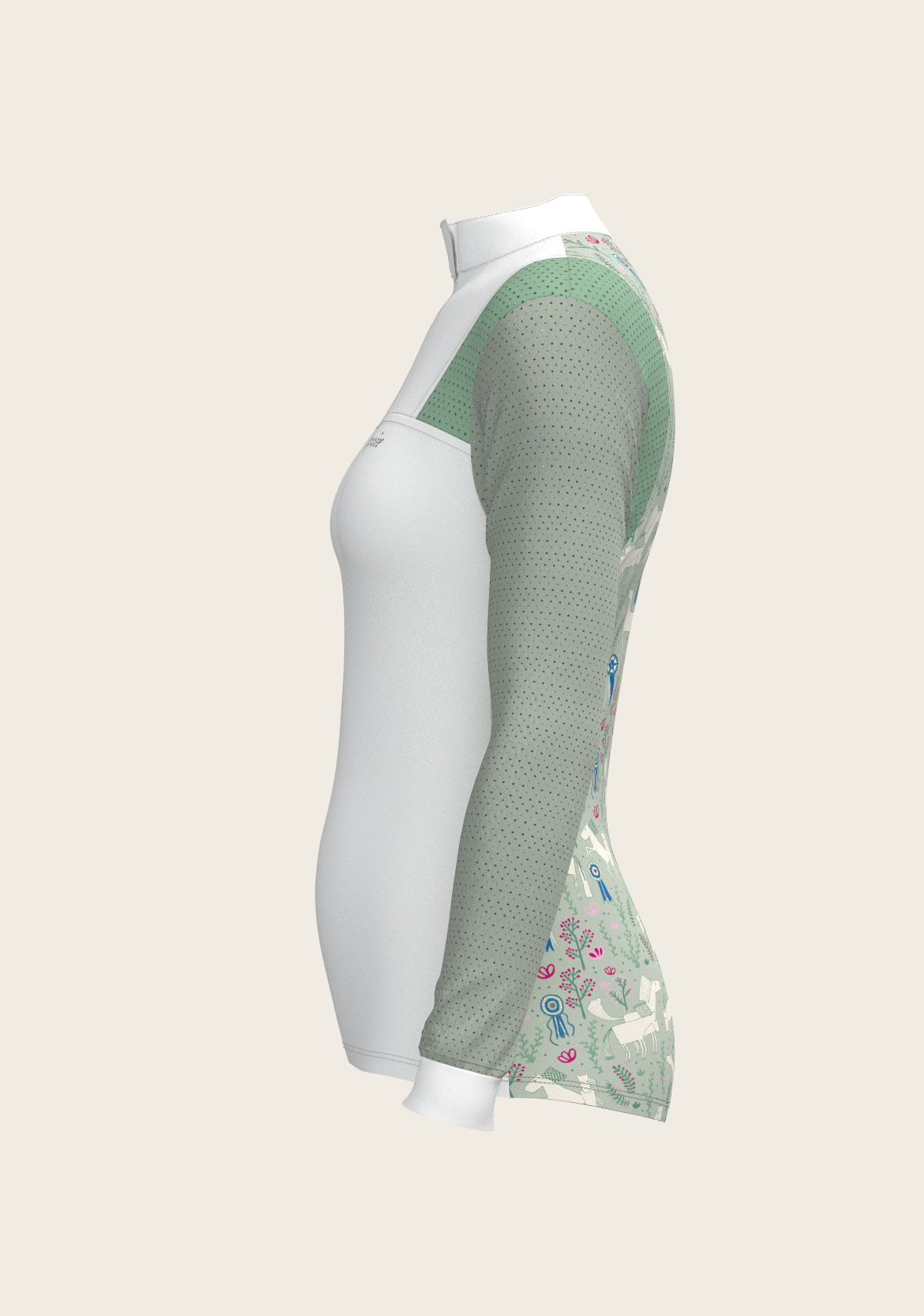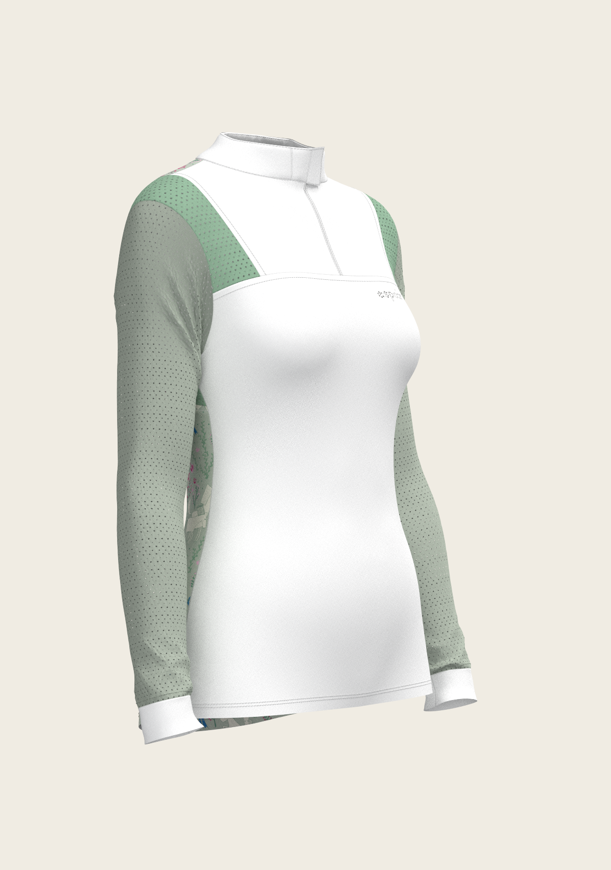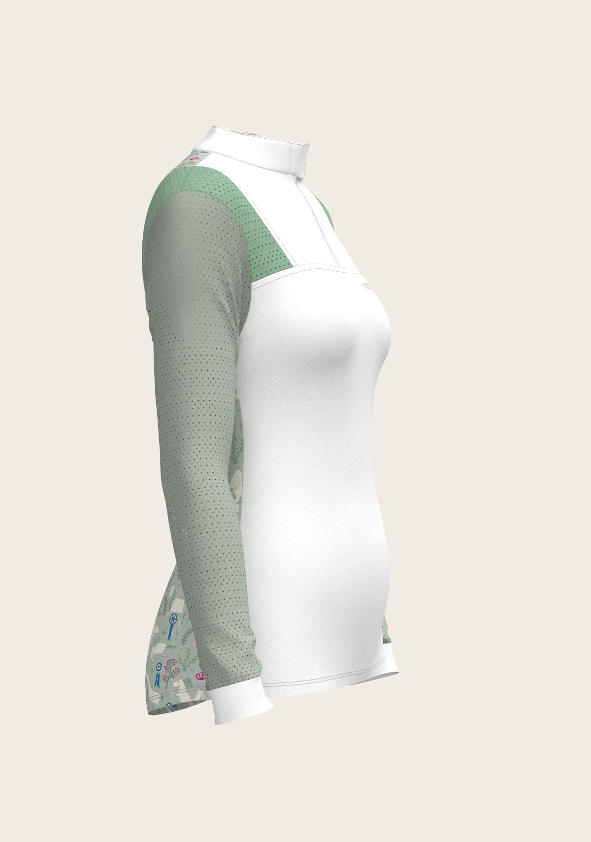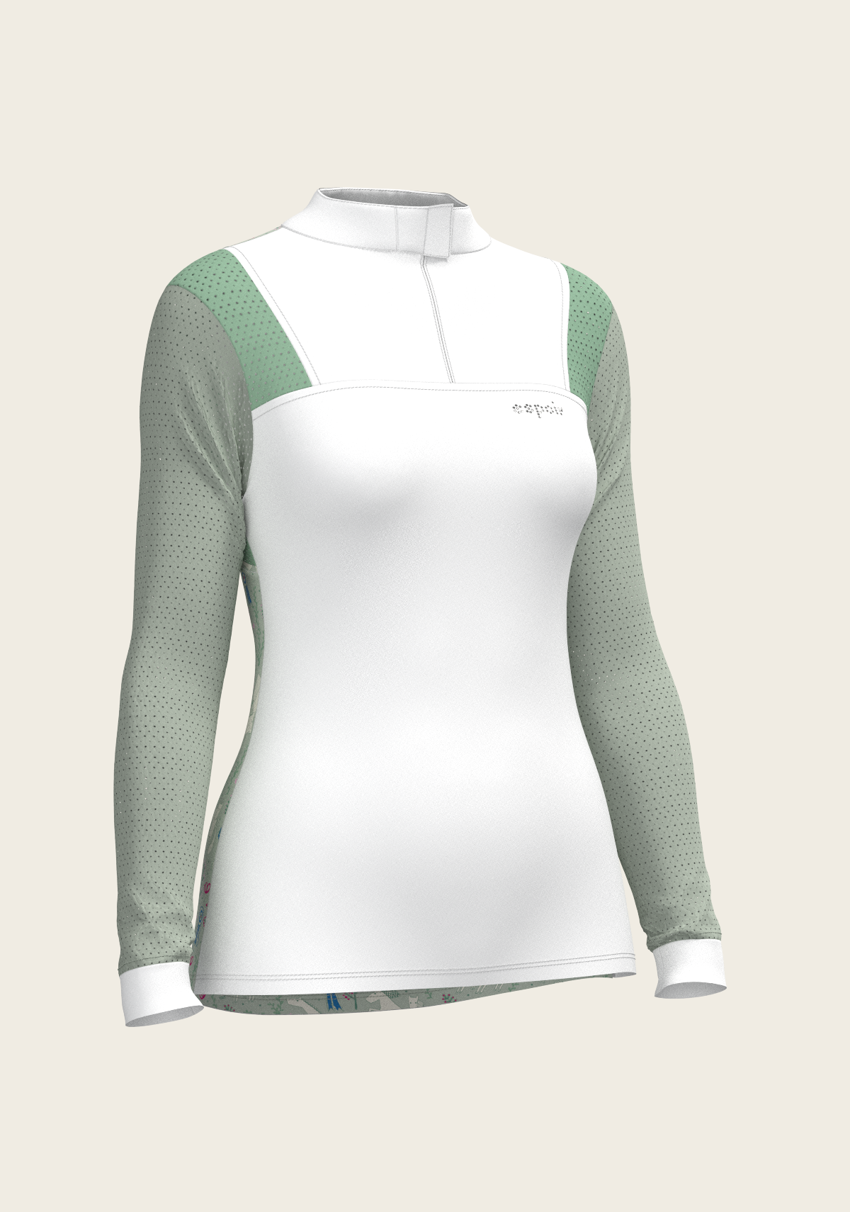 A sporty looking show shirt made from luxurious technical fabrics. A hidden quarter zip is neatly constructed by a printed inner detailed fabric. On the front chest there is a Swarovski logo detail. Two hidden stud buttons easily closes the top collar. Mesh inserts on the front and back of the shirt add beautiful details. The back of the collar has our signature Espoir ribbon detail. These show shirts are available in long and short sleeve.