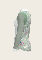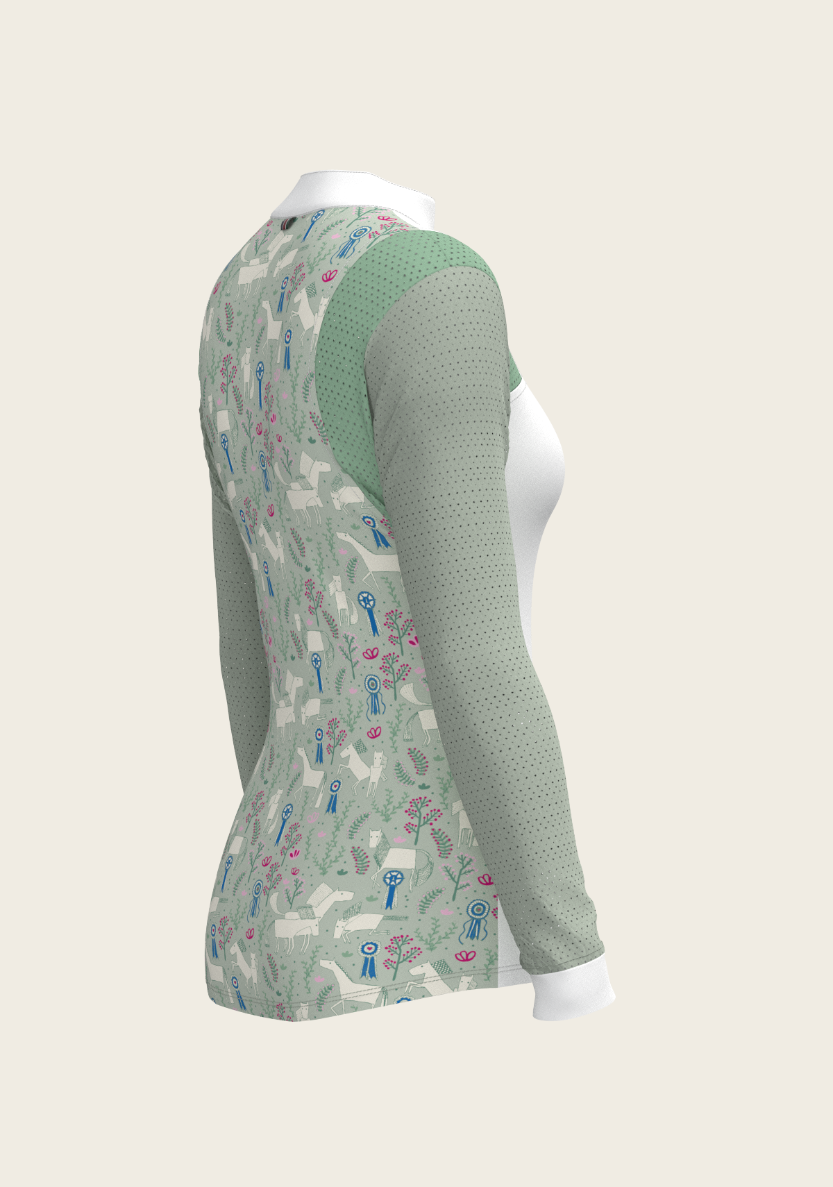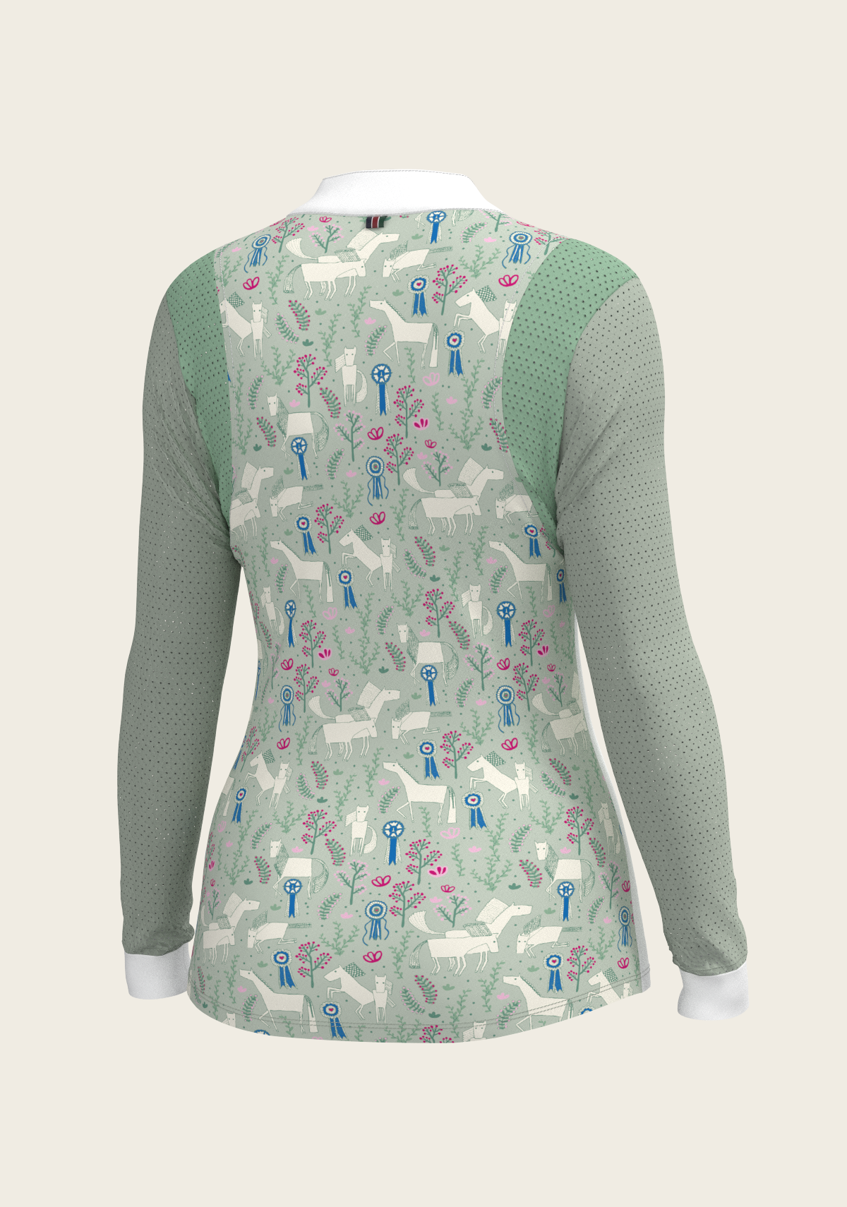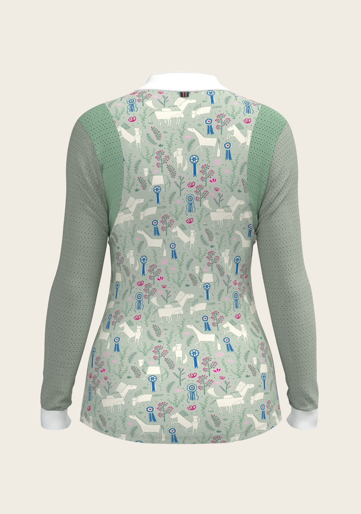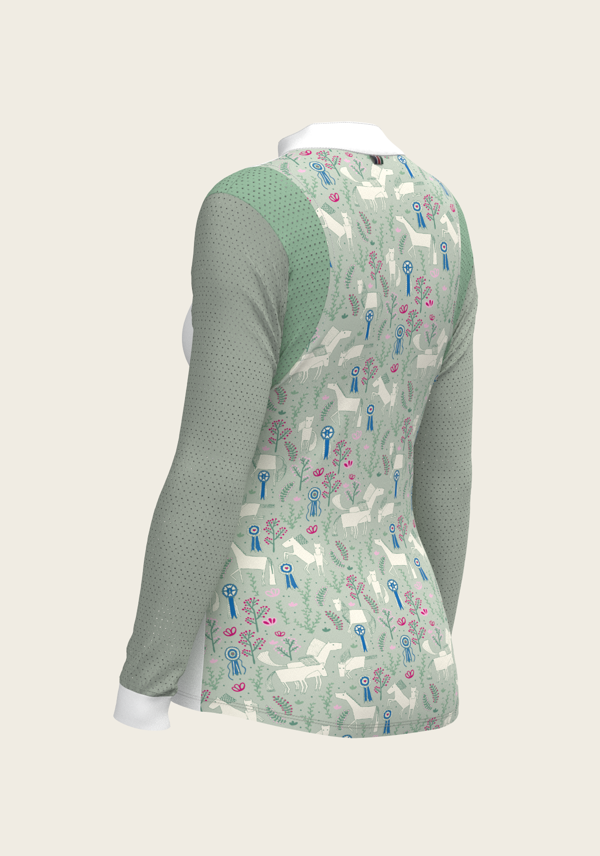 A sporty looking show shirt made from luxurious technical fabrics. A hidden quarter zip is neatly constructed by a printed inner detailed fabric. On the front chest there is a Swarovski logo detail. Two hidden stud buttons easily closes the top collar. Mesh inserts on the front and back of the shirt add beautiful details. The back of the collar has our signature Espoir ribbon detail. These show shirts are available in long and short sleeve.