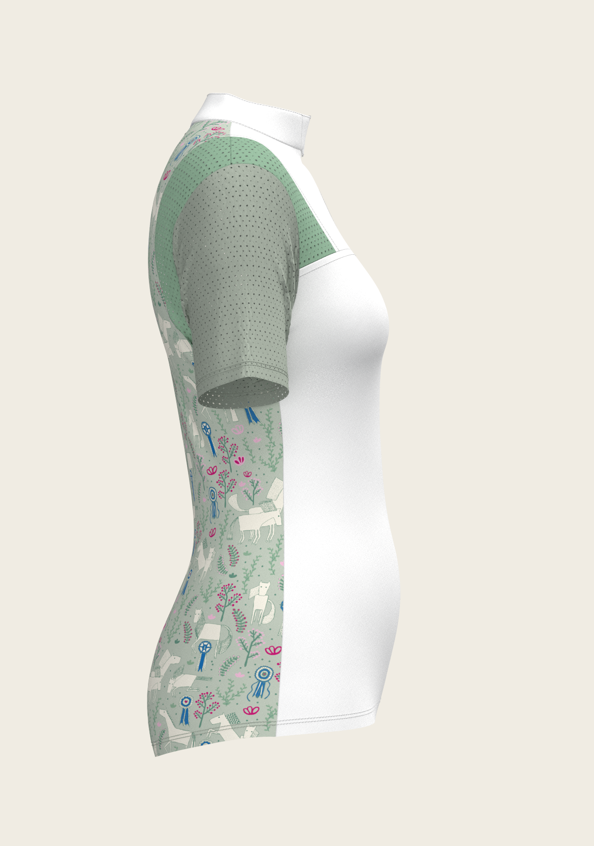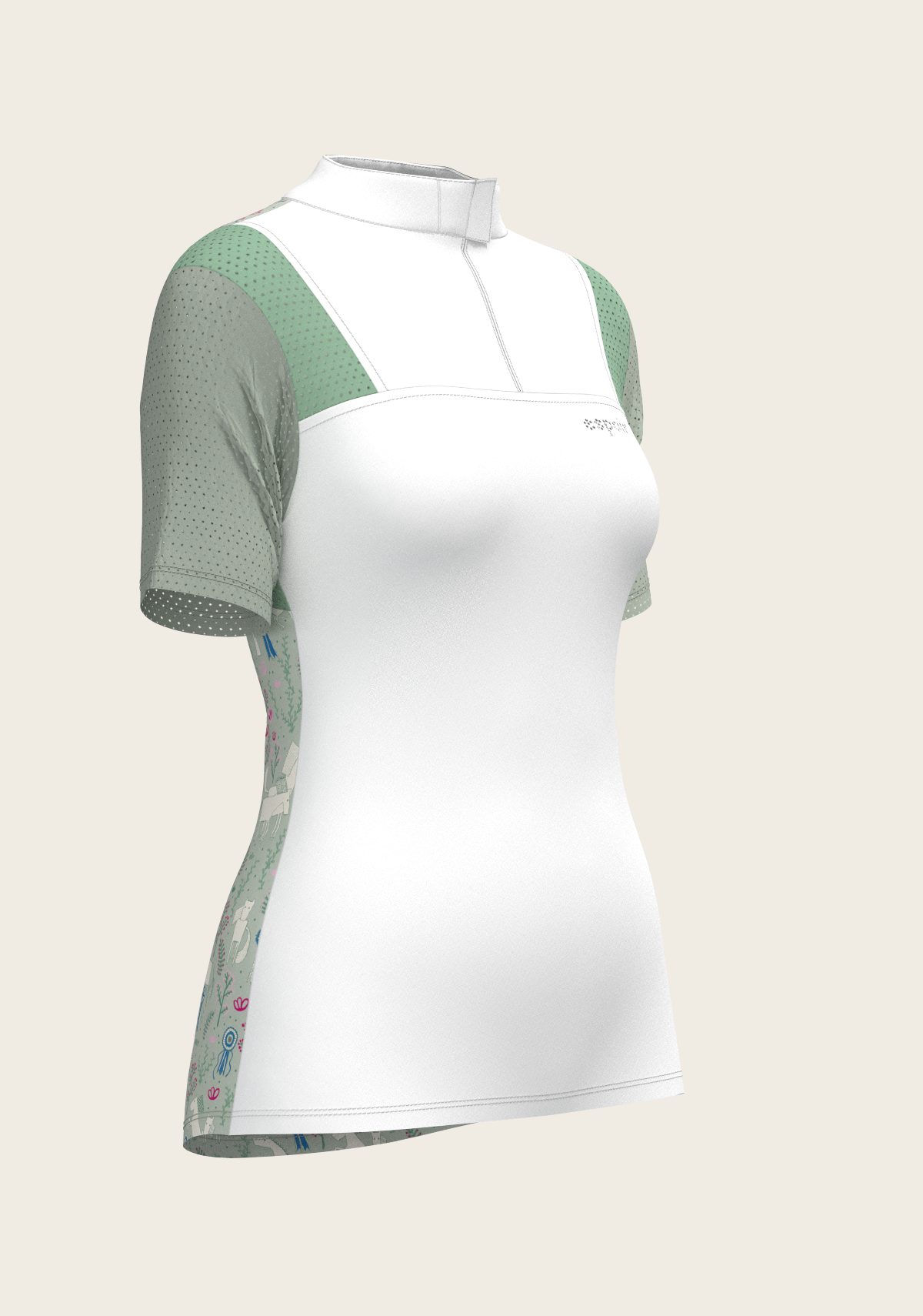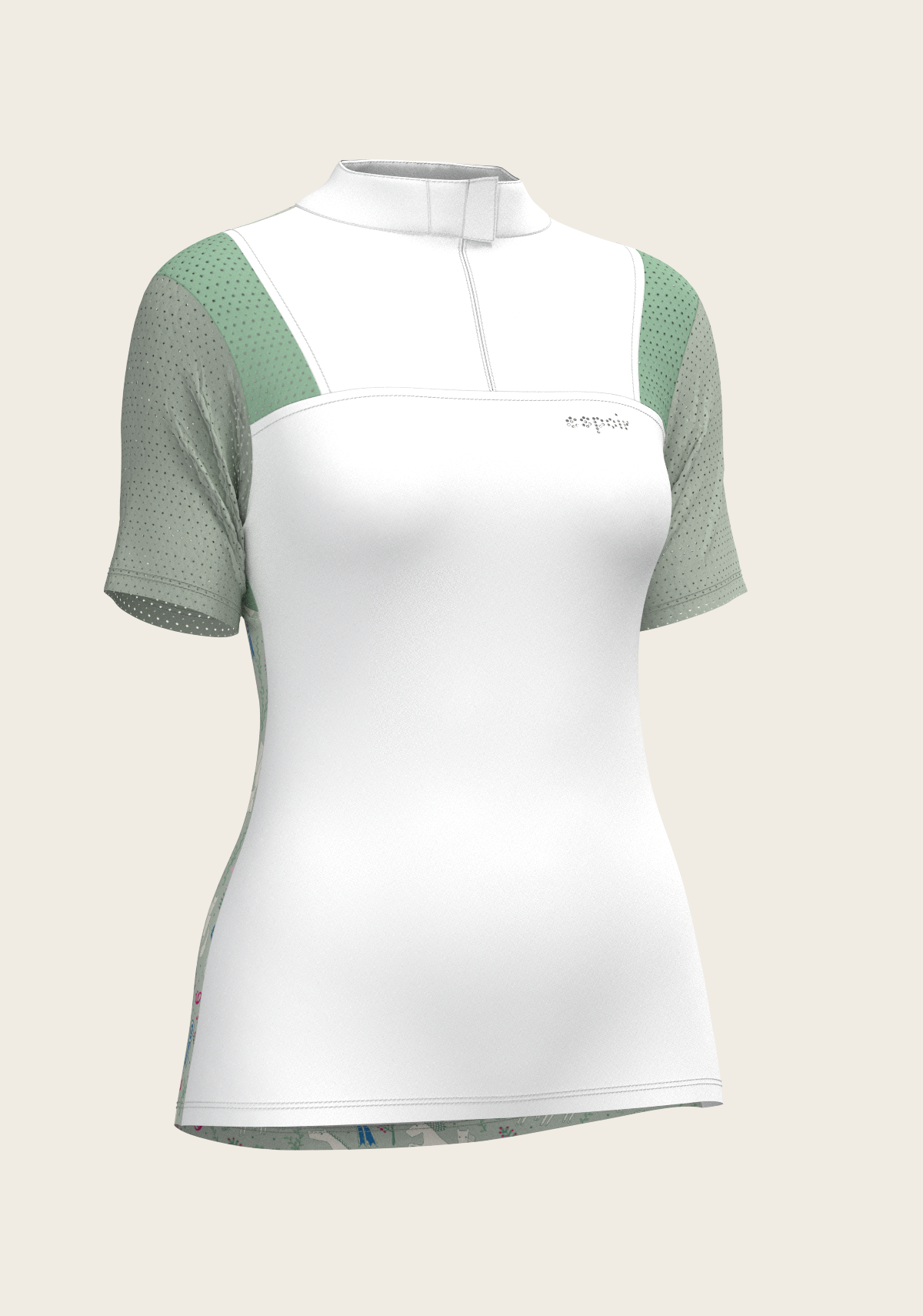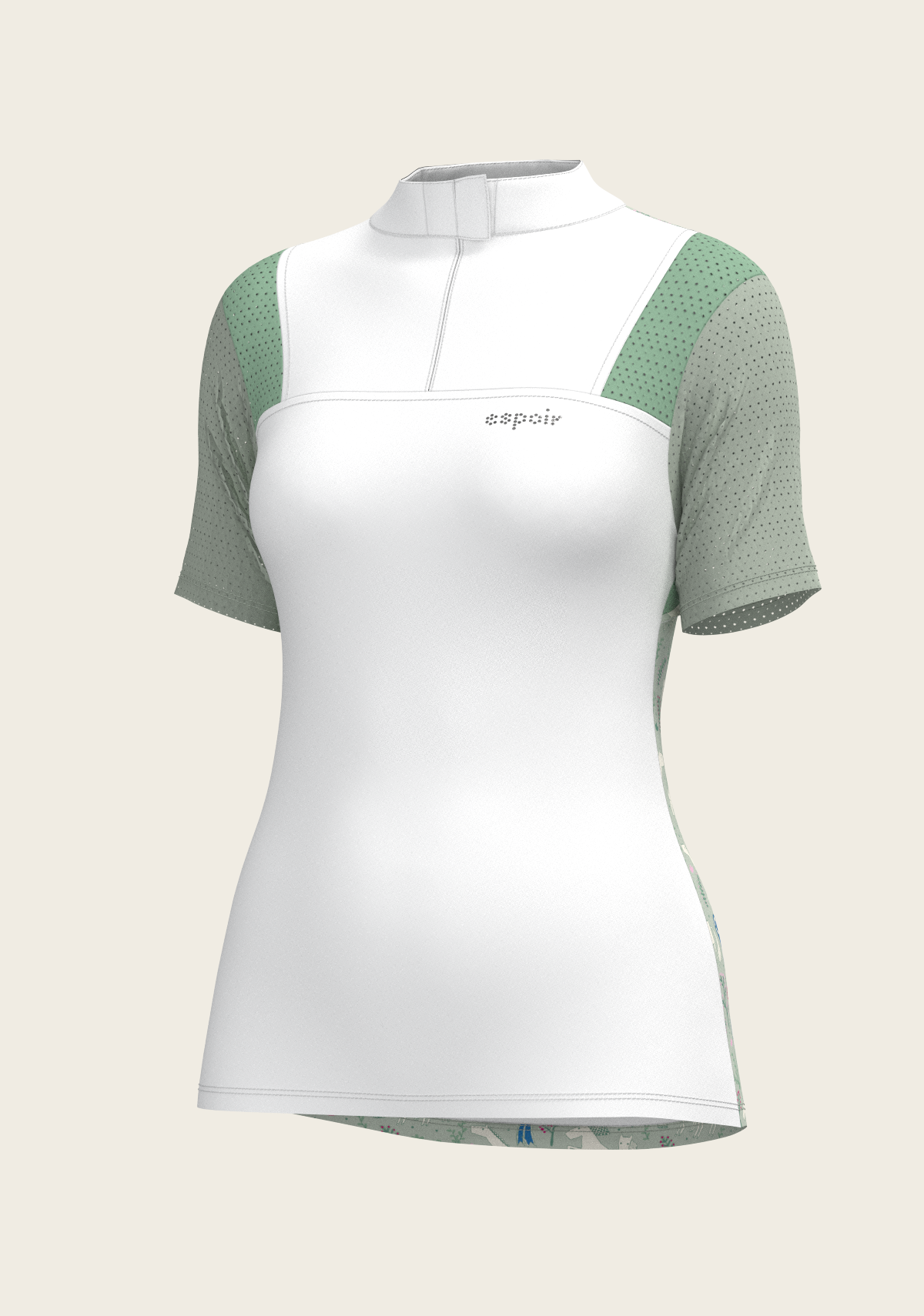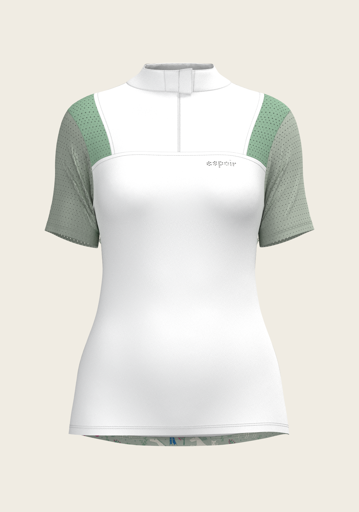 A sporty looking show shirt made from luxurious technical fabrics. A hidden quarter zip is neatly constructed by a printed inner detailed fabric. On the front chest there is a Swarovski logo detail. Two hidden stud buttons easily closes the top collar. Mesh inserts on the front and back of the shirt add beautiful details. The back of the collar has our signature Espoir ribbon detail. These show shirts are available in long and short sleeve.