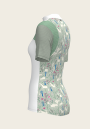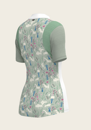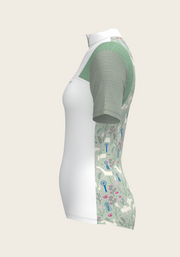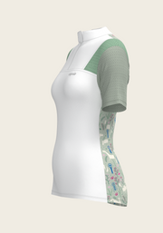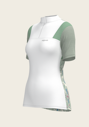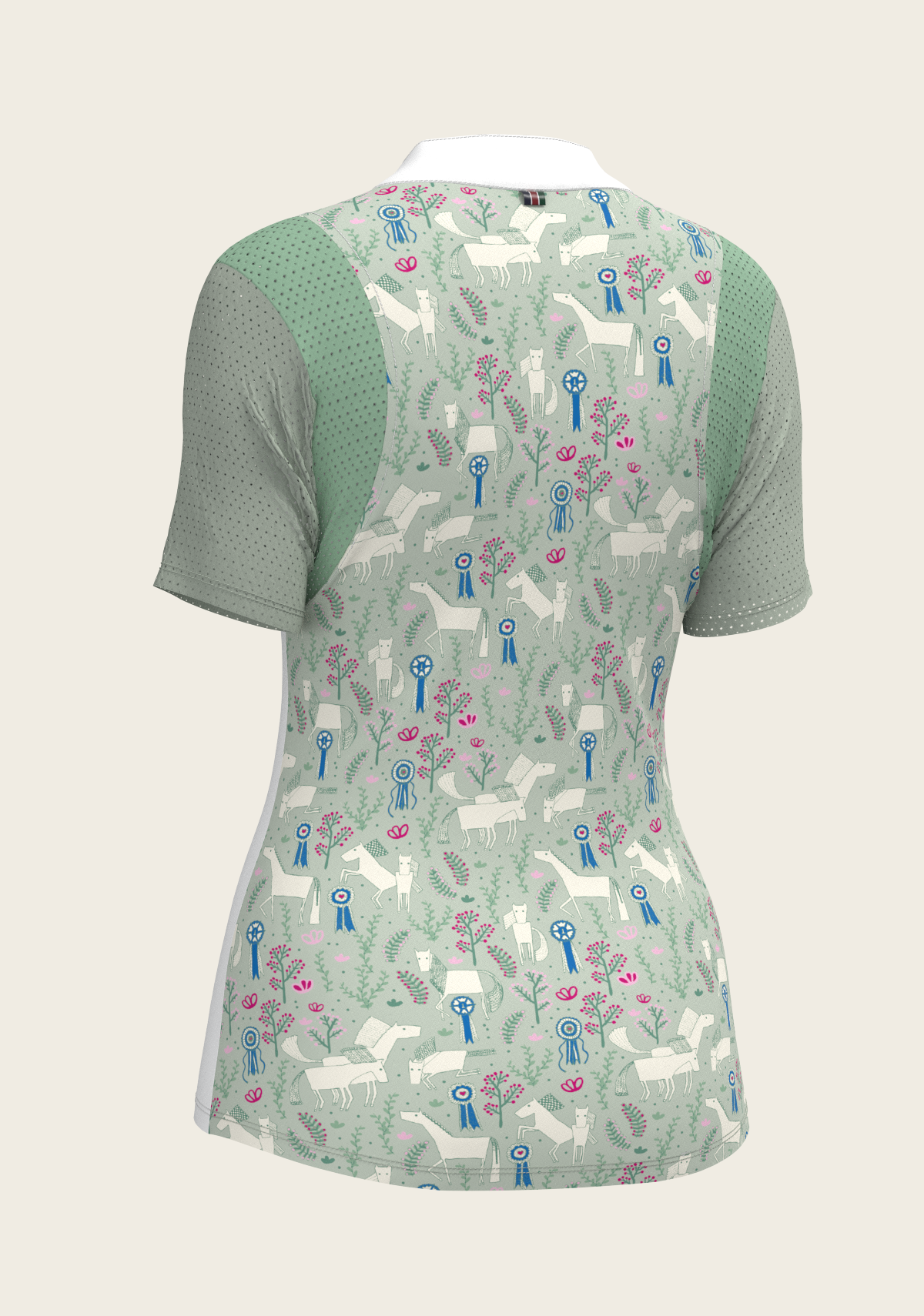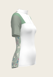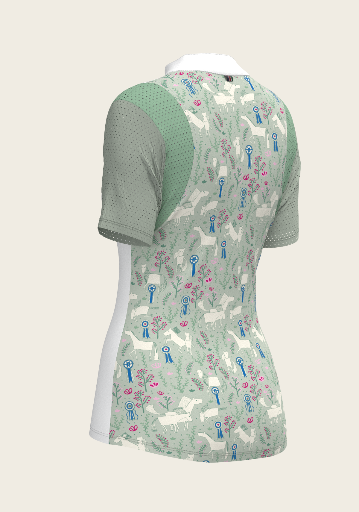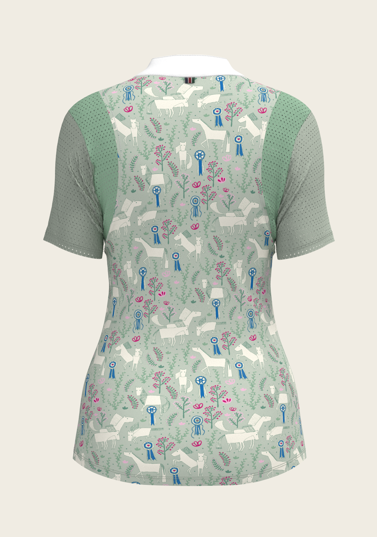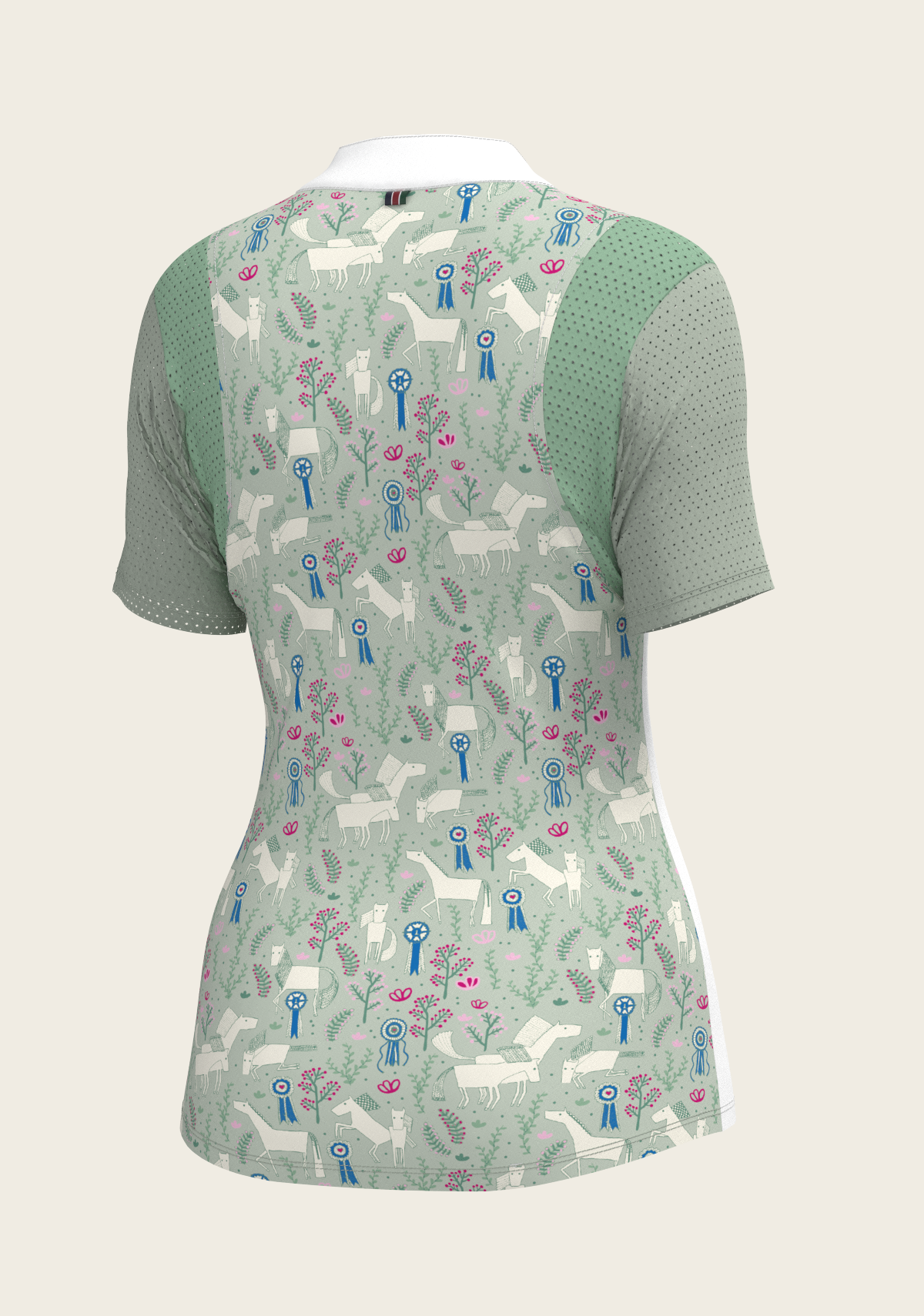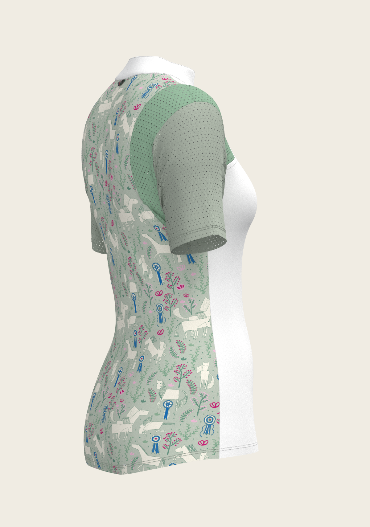 A sporty looking show shirt made from luxurious technical fabrics. A hidden quarter zip is neatly constructed by a printed inner detailed fabric. On the front chest there is a Swarovski logo detail. Two hidden stud buttons easily closes the top collar. Mesh inserts on the front and back of the shirt add beautiful details. The back of the collar has our signature Espoir ribbon detail. These show shirts are available in long and short sleeve.