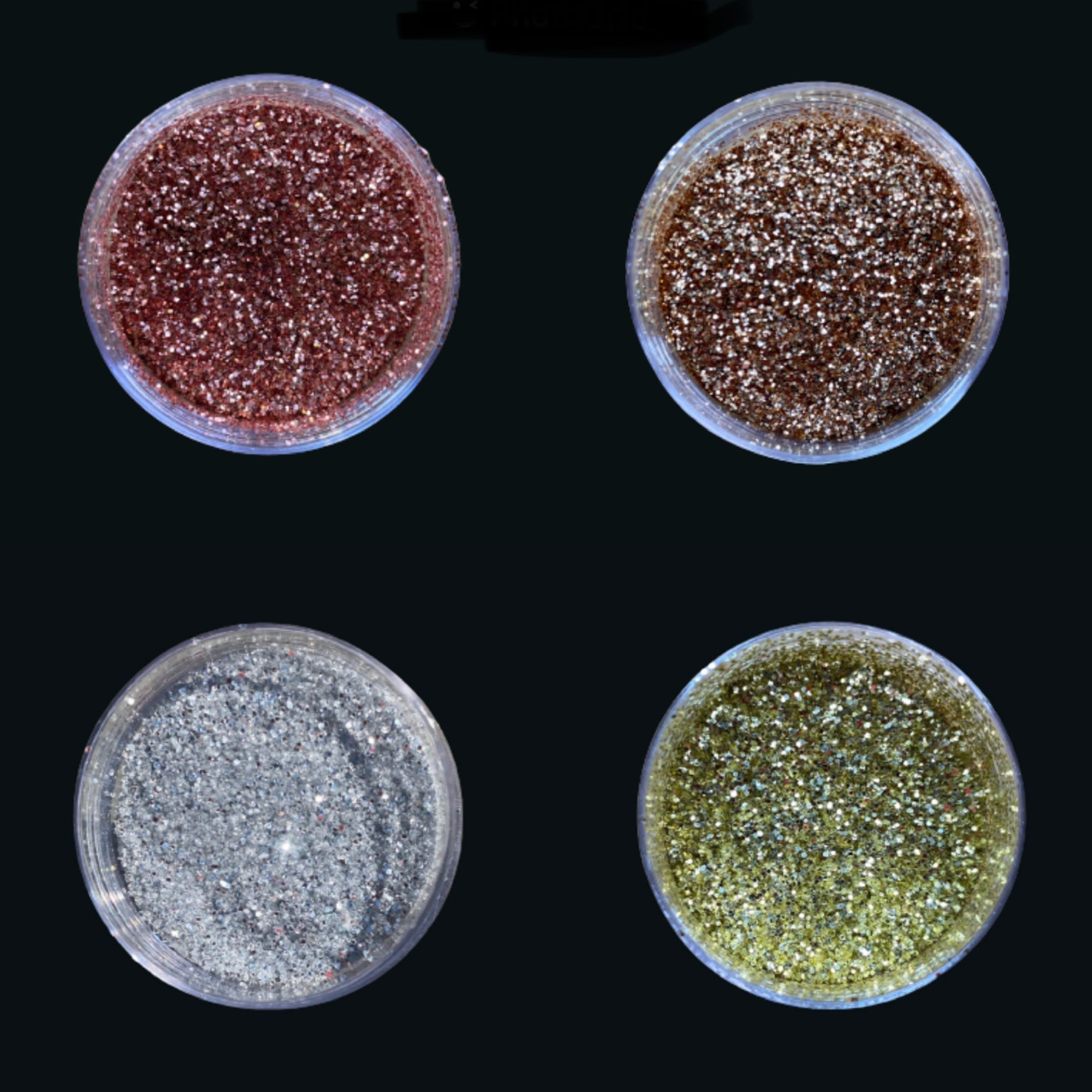 2 jars of adhesive, 4 application brushes, and craft tweezers