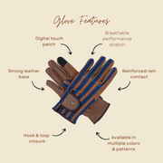 The palms are built from genuine goat leather, with reinforced suede grip patches at rein contact points. The outer layer of stretch mesh or jersey works with the natural movement of your hands, providing comfort and breathability. Secured with an easy velcro closure, finished with digital touch screen patches for your devices.