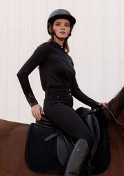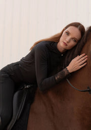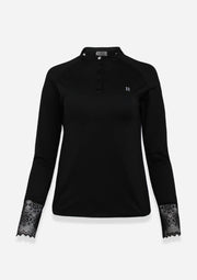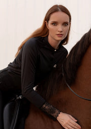 Introducing the Amelie show shirt, a refined essential for every equestrian wardrobe. Crafted from a silky, lightweight technical fabric, it features delicate lace accents on the cuffs and back, bringing a touch of femininity and elegance to your riding look.