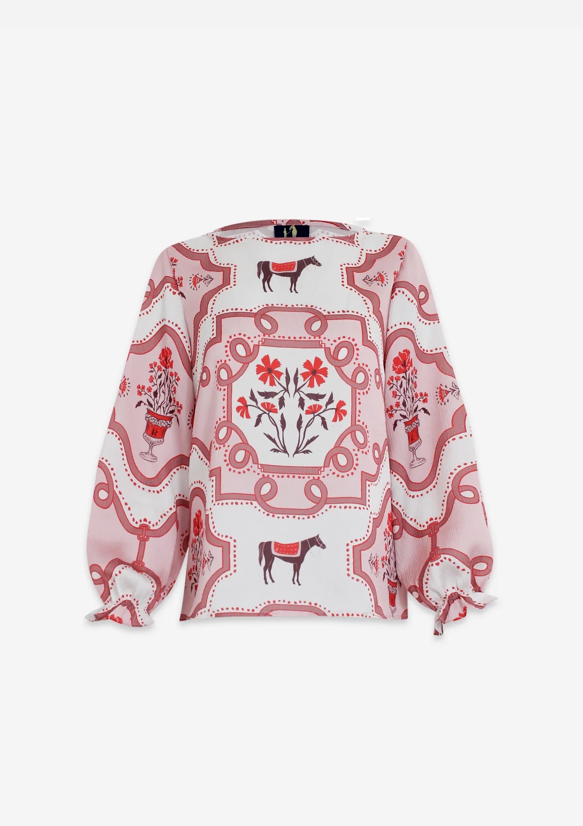 Effortlessly elegant and versatile, this classic blouse is a timeless wardrobe essential. Featuring a flattering neckline and long sleeves with soft elastic at the wrists, it offers both comfort and sophistication. Showcasing our latest Veranda Print, with its graceful motifs of flower pots, arabesques, and horses, this blouse comes in two rich colorways: delicate pink hues and bold burgundy. Perfect to pair with jeans for casual looks or more elegant outfits, it exudes charm and grace in every detail.