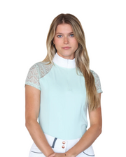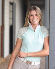 The Daphne Shirt is both delicate and technical. The shoulders and short sleeves are covered in a 4-way stretch lace. The front zip closure is easy to fasten for showtime, or fold over the collar for a stylish practice ensemble. The fabric is lightweight to keep you cool and refreshed. The Daphne Shirt is made from 73% Polyester, 27% Spandex.