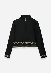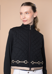 Introducing our Ember Cropped Jacket – a modern silhouette designed to pair seamlessly with high-waist breeches or leggings. Featuring unique equestrian embroideries, a quilted texture, high collar, and golden-silver hem details, this jacket adds a touch of sophistication to any outfit. From the barn to yoga, embrace chic versatility effortlessly!